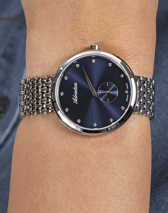 Часы Adriatica A3724.5145Q представляют собой гармоничное сочетание швейцарского качества и изысканного дизайна, подходящие для ценителей стильных аксессуаров. Их синий циферблат, украшенный 12 фианитами, а секундная стрелка вынесена на отдельный циферблат, что придает особую утонченность и элегантность. Корпус диаметром 34 мм и толщиной 7 мм выполнен из нержавеющей стали, что обеспечивает долговечность и надежность. Кварцевый механизм гарантирует точность хода, а водозащита 30WR защищает часы от случайных брызг. Браслет из нержавеющей стали с ювелирной застежкой обеспечивает комфортное ношение и добавляет изделию дополнительную элегантность. Минеральное стеклоМинеральное стеклоМинеральное стекло представляет собой искусственно выращенный минерал кварца. Такое стекло отличается особой устойчивостью к повреждениям и царапинам. Уступает по некоторым качествам сапфировому стеклу. защищает циферблат от внешних воздействий, сохраняя его безупречный вид. Часы Adriatica A3724.5145Q — это идеальный аксессуар для тех, кто ценит швейцарское качество и утонченный стиль.