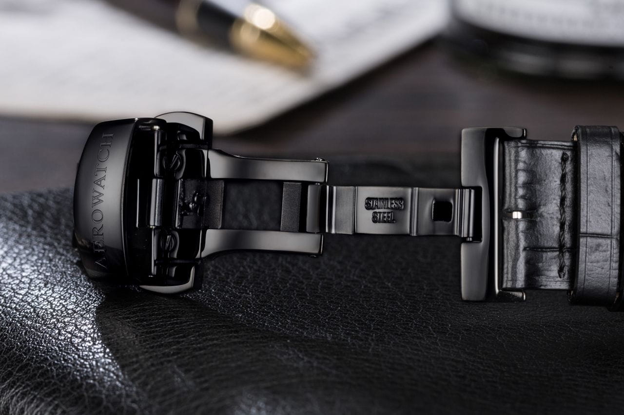 Ремешок выполнен из натуральной кожи чёрного цвета и дополнен раскладывающейся застёжкой.  Толщина корпуса составляет 12 мм, что придаёт часам солидный вид.