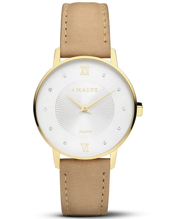 Amalys AMW-179 — женская модель с утончённым классическим дизайном, в которой сочетаются элегантность и практичность. Круглый корпус диаметром 33 мм выполнен из нержавеющей стали с PVD-покрытиемPVDУльтратонкое покрытие наносится в технике вакуумного напыления, сочетает в себе нитрид титана особой прочности со слоем золота или оксида хрома. Несёт в себе декоративную или защитную функцию., гармонирующим с ремешком шириной 16 мм в том же исполнении. Защитную функцию выполняет сапфировое стеклоСапфировое стеклоПрочный и надёжный материал из кристалла сапфира синтетического происхождения, характеризующийся особой твёрдостью и устойчивостью к царапинам и повреждениям., стойкое к царапинам и сохраняющее прозрачность. Механизм — кварцевый, обеспечивающий точность и стабильность хода. Кожаный ремешок на стандартной застежке, который сочетает надёжность фиксации и удобство повседневного использования. Водозащита 3 ATM защищает часы от случайных брызг и дождя. Циферблат с римскими индексами и изящными стрелками подчёркивает классическую эстетику модели, делая её уместной как в повседневных образах, так и в торжественной обстановке.