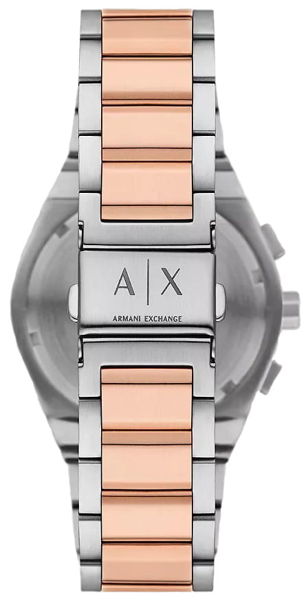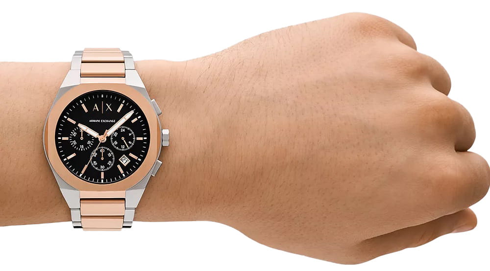 Мужские наручные часы-хронографХронографФункция позволяет измерять отрезки времени с особой точностью: часы, минуты, секунды. Верным признаком хронографа является наличие на циферблате 3 дополнительных окошек-счётчиков. Armani Exchange Rafael AX4181 сочетают в себе практичность и стильный дизайн, идеально подходя как для повседневной носки, так и для занятий спортом. Часы оснащены круглым корпусом из нержавеющей стали, диаметром 42 мм. Особенностью модели является наличие окошка даты, расположенного между отметками 4 и 5 часов, что добавляет функциональности аксессуару. Стрелки обладают люминесцентным покрытиемЛюминесцентное покрытиеПозволяет считывать показания времени в темноте. Производители наносят на стрелки, часовые индексы, безель или поверхность циферблата светонакопительный состав, дающий холодное свечение., которое светится в темноте после зарядки на свету, обеспечивая отличную видимость в любых условиях. Неподвижный безельБезельВнешний ободок, закрепляющий стекло. В спортивных часах так называется поворотное кольцо с делениями на циферблате, выполняет роль таймера – замеряет отрезки времени на шкале. Неподвижный безель – элемент декора. Однонаправленно вращающийся безель на дайверских часах позволяет фиксировать моменты погружения и выныривания на поверхность. с IP-покрытиемIP-покрытиеМетод ионного напыления. Демонстрирует повышенную устойчивость к истиранию, окислению и химическим веществам. Под воздействием высокого давления и температуры около 1500°C молекулы металла надёжно соединяются с частицами корпуса часов.. Защиту циферблата обеспечивают минеральное стеклоМинеральное стеклоМинеральное стекло представляет собой искусственно выращенный минерал кварца. Такое стекло отличается особой устойчивостью к повреждениям и царапинам. Уступает по некоторым качествам сапфировому стеклу., которое устойчиво к царапинам и сохраняет прозрачность на протяжении всего срока службы. Стальной браслет на раскладной застёжкеРаскладная застёжкаТакой тип застёжки используется только на браслетах из металла. Она никогда не раскрывается полностью, происходит разделение на 2 и более частей. Раскладывающая застёжка снизит вероятность потери часов к минимуму. с частичным с IP-покрытиемIP-покрытиеМетод ионного напыления. Демонстрирует повышенную устойчивость к истиранию, окислению и химическим веществам. Под воздействием высокого давления и температуры около 1500°C молекулы металла надёжно соединяются с частицами корпуса часов. не только комфортен в ношении, но и практичен благодаря своей прочности. Модель обладает водозащитой до 50 метров, что позволит защитить корпус от случайных брызг или капель дождя.