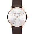 Кварцевые американские женские часы с минеральным стекломМинеральное стеклоМинеральное стекло представляет собой искусственно выращенный минерал кварца. Такое стекло отличается особой устойчивостью к повреждениям и царапинам. Уступает по некоторым качествам сапфировому стеклу. Armani Exchange AX5592, кварцевый механизм с высокой точностью. Класс водозащиты: 50 метров, позволит защитить корпус от случайных брызг или капель дождя. Корпус часов изготовлен из стали с IP-покрытиемIP-покрытиеМетод ионного напыления. Демонстрирует повышенную устойчивость к истиранию, окислению и химическим веществам. Под воздействием высокого давления и температуры около 1500°C молекулы металла надёжно соединяются с частицами корпуса часов.. Кожаный ремешок. Класс водозащиты: 50 метров, позволит защитить корпус от случайных брызг или капель дождя