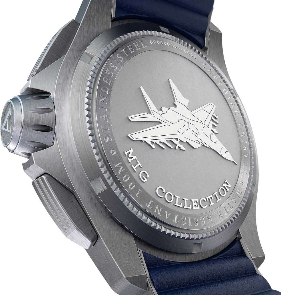 Aviator M.2.19.0.143.6 “MiG‑35” — выразительный швейцарский хронограф, вдохновлённый аэродинамикой и духом истребителя MiG‑35. Корпус диаметром 45 мм из нержавеющей стали подчёркивает мощь и надёжность, дополнен герметичной конструкцией до 100 м и завинчивающейся заводной головкой.