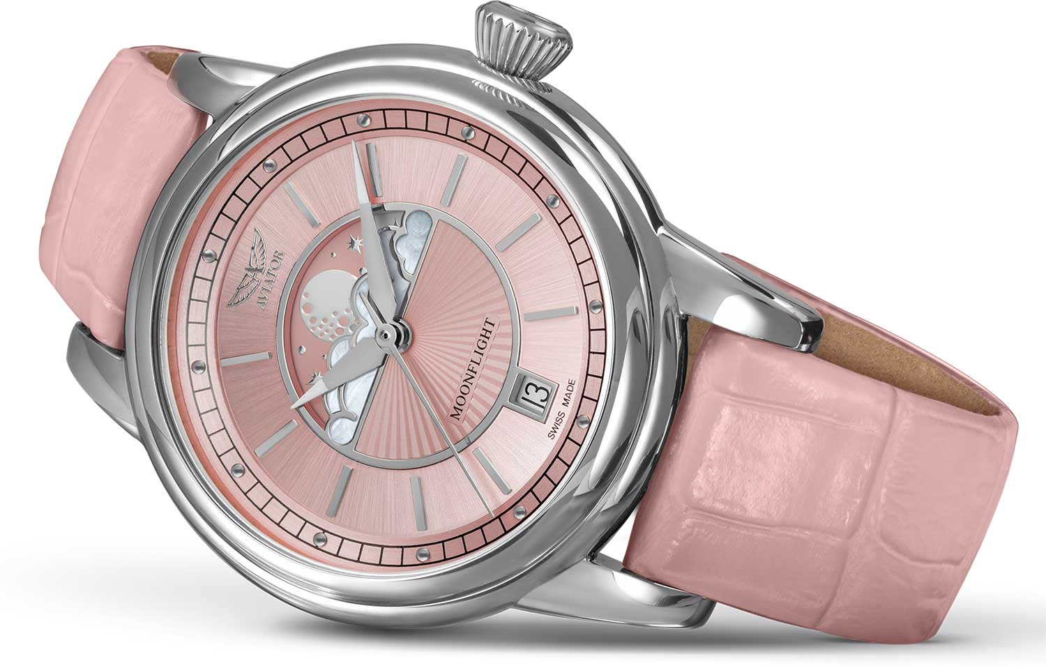 Aviator V.1.33.0.257.4 “Douglas Moonflight” — элегантный дамский швейцарский Moonphase с утончённой авиационной эстетикой. Корпус 36 мм из нержавеющей стали с полированной отделкой обладает компактными пропорциями и удобным литым профилем.