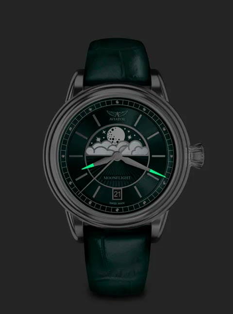 Aviator V.1.33.0.262.4 “Douglas Moonflight” — элегантный дамский швейцарский Moonphase с утончённой авиационной эстетикой. Корпус 36 мм из нержавеющей стали с полированной отделкой обладает компактными пропорциями и удобным литым профилем.