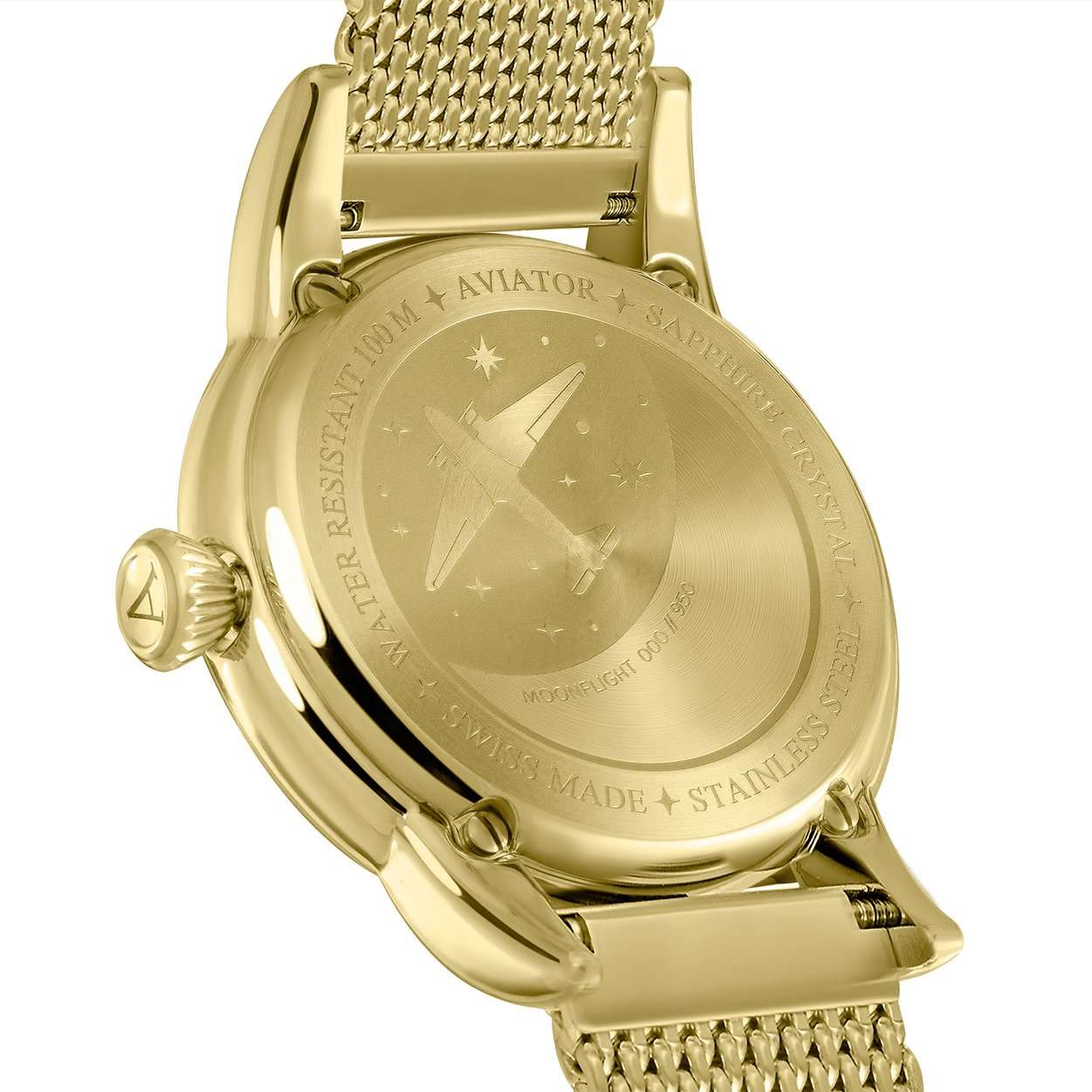 Aviator V.1.33.1.343.5 “Douglas Moonflight” — элегантный дамский швейцарский Moonphase с утончённой авиационной эстетикой. Корпус 36 мм из нержавеющей стали с PVD-покрытиемPVDУльтратонкое покрытие наносится в технике вакуумного напыления, сочетает в себе нитрид титана особой прочности со слоем золота или оксида хрома. Несёт в себе декоративную или защитную функцию. с полированной отделкой обладает компактными пропорциями и удобным литым профилем.