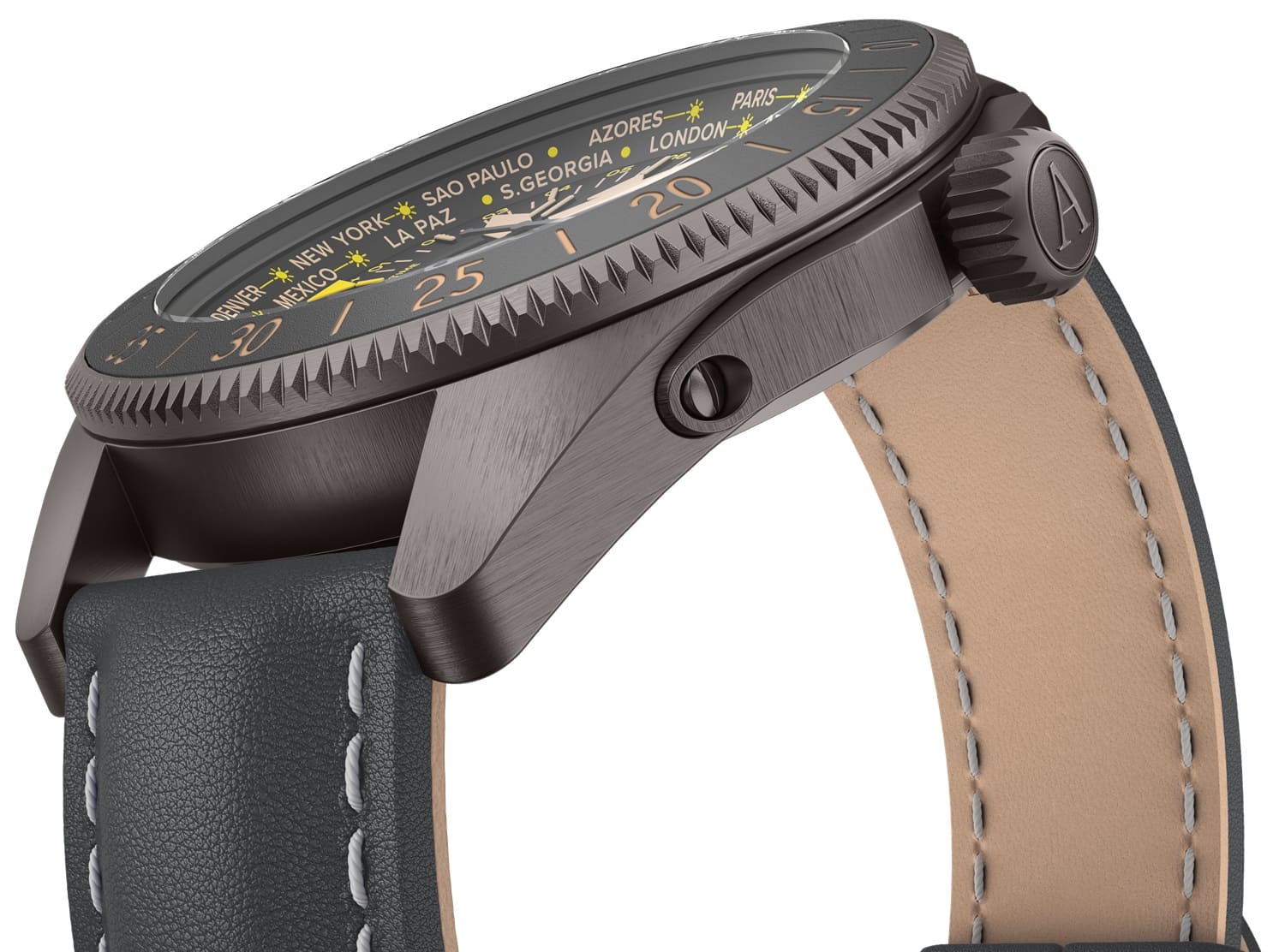 Циферблат отличается детальной функциональностью: в центре — крупные арабские цифры и стрелки, покрытые люминесцентным покрытиемЛюминесцентное покрытиеПозволяет считывать показания времени в темноте. Производители наносят на стрелки, часовые индексы, безель или поверхность циферблата светонакопительный состав, дающий холодное свечение., обеспечивающими мгновенное считывание времени даже в темноте. На «3 часах» — окошко даты, а индикатор второго часового пояса (GMT) удобно расположен на «9 часах». С внешней стороны — вращающийся безельБезельВнешний ободок, закрепляющий стекло. В спортивных часах так называется поворотное кольцо с делениями на циферблате, выполняет роль таймера – замеряет отрезки времени на шкале. Неподвижный безель – элемент декора. Однонаправленно вращающийся безель на дайверских часах позволяет фиксировать моменты погружения и выныривания на поверхность. с PVD-покрытиемPVDУльтратонкое покрытие наносится в технике вакуумного напыления, сочетает в себе нитрид титана особой прочности со слоем золота или оксида хрома. Несёт в себе декоративную или защитную функцию. с насечкой и градусной шкалой для секунд — идеален для расчёта времени пути или времени прибытия .