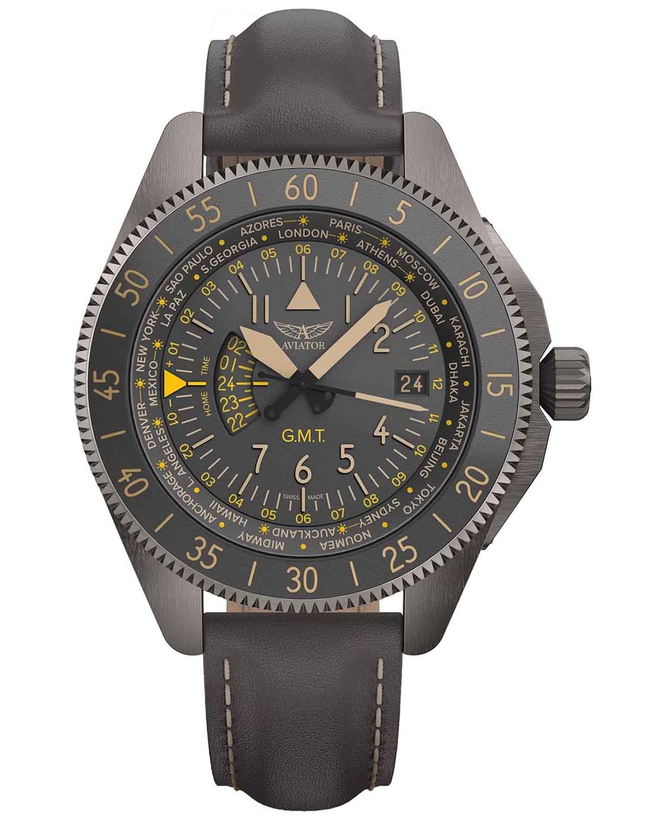 Aviator Airacobra V.1.37.7.305.4 “Airacobra GMT” — сбалансированный швейцарский пилотский GMT, сочетающий техническую строгость с удобными функциями для путешествий. Корпус диаметром 43 мм из нержавеющей стали с PVD-покрытиемPVDУльтратонкое покрытие наносится в технике вакуумного напыления, сочетает в себе нитрид титана особой прочности со слоем золота или оксида хрома. Несёт в себе декоративную или защитную функцию. обеспечивает уверенное ощущение надёжности, а герметичность до 100 м защищает при любой погоде .