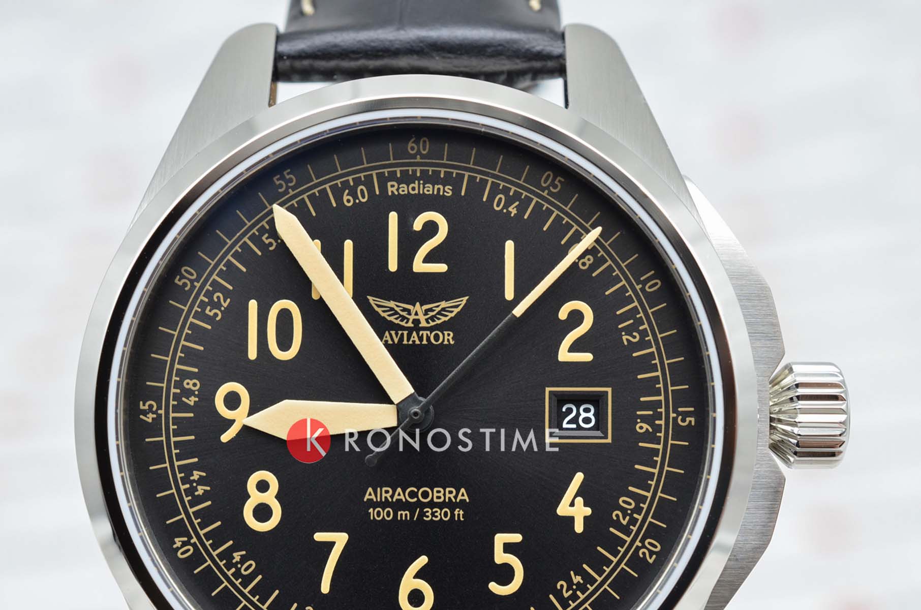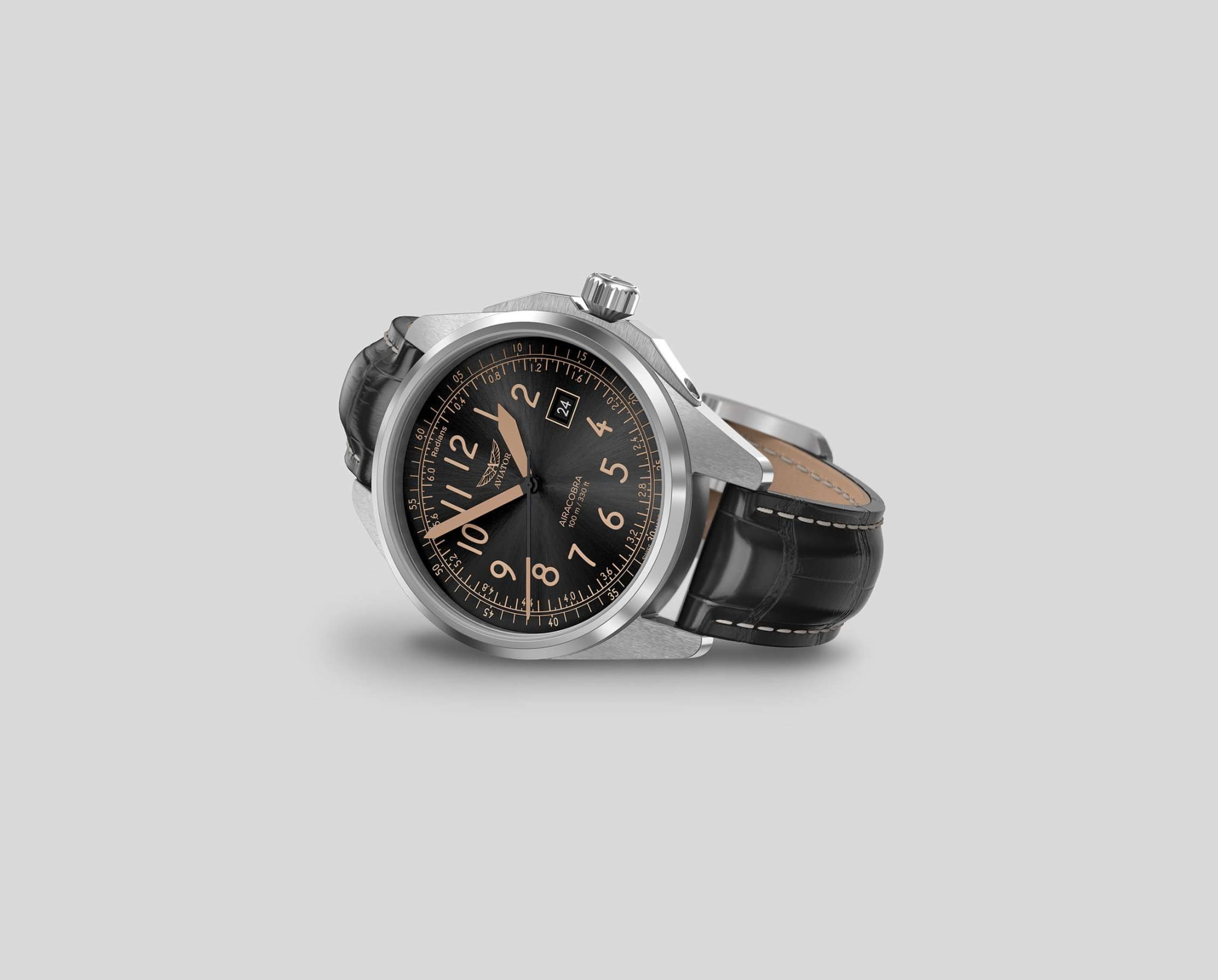 Aviator V.1.38.0.323.4 “Airacobra 43 Type A” — надёжные швейцарские пилотские часы с насыщенным функционалом и строгим авиационным дизайном. Корпус диаметром 42,8 мм выполнен из нержавеющей стали.