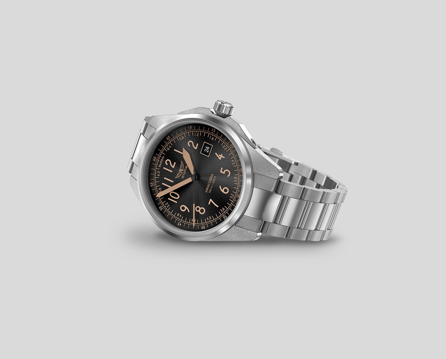 Aviator Airacobra 43 Type B V.1.38.0.323.5 — надёжные швейцарские пилотские часы с насыщенным функционалом и строгим авиационным дизайном. Корпус диаметром 42,8 мм выполнен из нержавеющей стали 316L. Элегантный циферблат имеет крупные арабские цифры. Стрелки и метки покрыты люминесцентным покрытиемЛюминесцентное покрытиеПозволяет считывать показания времени в темноте. Производители наносят на стрелки, часовые индексы, безель или поверхность циферблата светонакопительный состав, дающий холодное свечение. Superluminova — это обеспечивает отличную читаемость в любых условиях. Окошко даты расположено у отметки «3 часа». На борту установлен швейцарский кварцевый механизм, способный с высокой точностью отображать время, дату. В механизме 4 камня. Изысканный циферблат защищён стойким сапфировым стекломСапфировое стеклоПрочный и надёжный материал из кристалла сапфира синтетического происхождения, характеризующийся особой твёрдостью и устойчивостью к царапинам и повреждениям. с антибликовым покрытиемАнтибликовое покрытиеСлой оксида металла в 0,13-0,3 микрон, благодаря которому стекло часов не бликует и не отражает свет. Антибликовое покрытие уменьшает отражение света в 10 раз, обеспечивая отличную читаемость показателей циферблата., завинчивающаяся заводная головка и задняя крышка обеспечивают уровень водозащиты до 100 метров. Стальной браслет с раскладной застёжкойРаскладная застёжкаТакой тип застёжки используется только на браслетах из металла. Она никогда не раскрывается полностью, происходит разделение на 2 и более частей. Раскладывающая застёжка снизит вероятность потери часов к минимуму. обеспечивает удобство и надёжную фиксацию. Airacobra 43 Type B — инструментальные пилотские часы для тех, кто ценит надёжность, точность и удобную функциональность второго часового пояса в эстетике классических авиационных хронометров. Лимитированная серия.