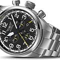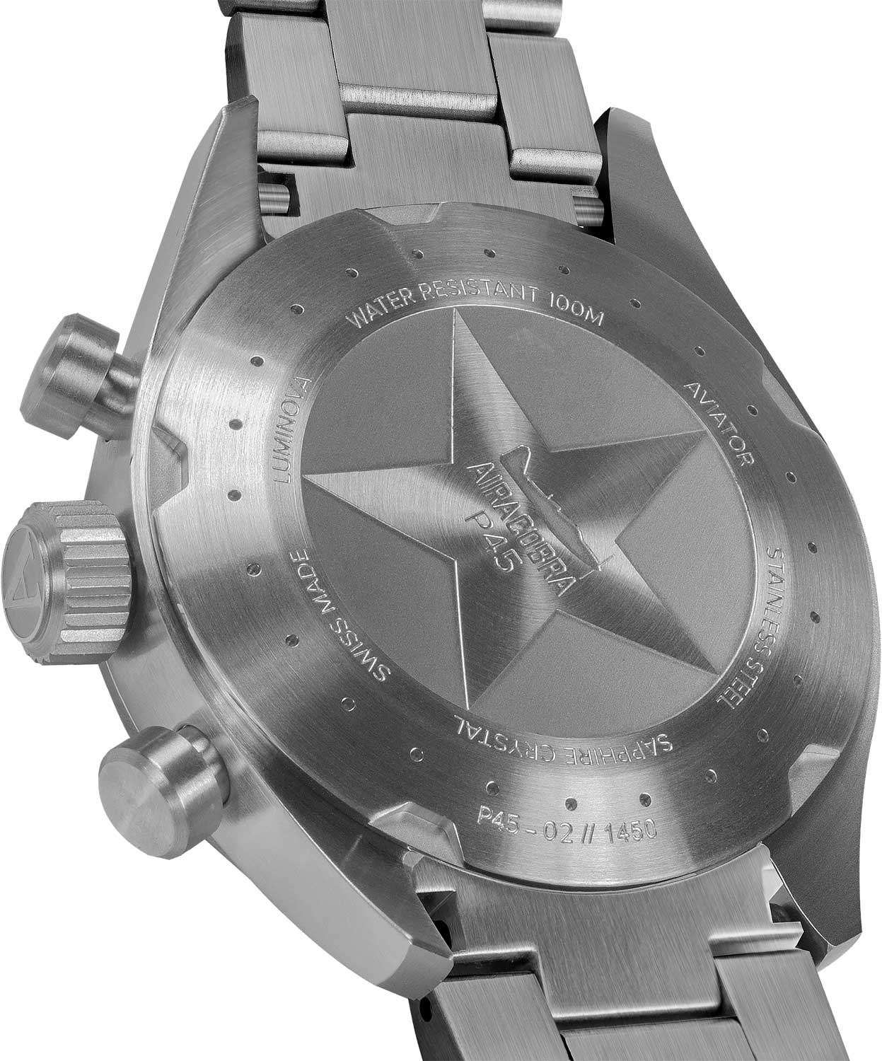 Aviator Airacobra V.2.25.0.169.5 — швейцарский GMT-хронограф в духе пилотских инструментов, объединяющий точность, удобство и лаконичный дизайн. Диаметр корпуса — 45 мм, выполнен из нержавеющей стали, что подчёркивает техническую надёжность в образе часов.