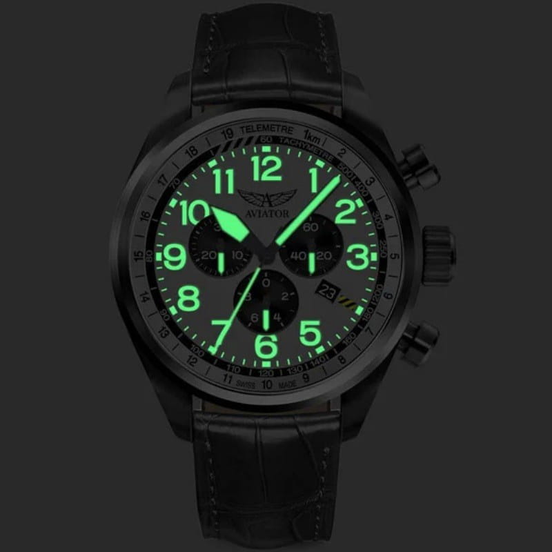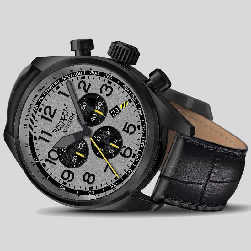 Aviator Airacobra P45 Chrono V.2.25.5.174.4 — швейцарские часы в духе пилотских инструментов, объединяющий точность, удобство и лаконичный дизайн. Диаметр корпуса — 45 мм, выполнен из нержавеющей стали 316L с PVD-покрытиемPVDУльтратонкое покрытие наносится в технике вакуумного напыления, сочетает в себе нитрид титана особой прочности со слоем золота или оксида хрома. Несёт в себе декоративную или защитную функцию., что подчёркивает техническую надёжность в образе часов. Циферблат оформлен в классическом aviator-стиле: крупные арабские цифры, широкие стрелки и чёткое деление минут позволяют считывать время мгновенно. Стрелки и метки покрыты люминесцентным покрытиемЛюминесцентное покрытиеПозволяет считывать показания времени в темноте. Производители наносят на стрелки, часовые индексы, безель или поверхность циферблата светонакопительный состав, дающий холодное свечение. Superluminova для отличной читаемости при слабом освещении. Циферблат защищён стойким сапфировым стекломСапфировое стеклоПрочный и надёжный материал из кристалла сапфира синтетического происхождения, характеризующийся особой твёрдостью и устойчивостью к царапинам и повреждениям. с антибликовым покрытиемАнтибликовое покрытиеСлой оксида металла в 0,13-0,3 микрон, благодаря которому стекло часов не бликует и не отражает свет. Антибликовое покрытие уменьшает отражение света в 10 раз, обеспечивая отличную читаемость показателей циферблата.. У модели присутствуют дата и точный откидной механизм завинчивающейся заводной головки и задней крышки, обеспечивающий надёжную водозащиту до 100 м и защиту от ударов. Внутри установлен швейцарский кварцевый механизм, который обеспечивает функции хронографаХронографФункция позволяет измерять отрезки времени с особой точностью: часы, минуты, секунды. Верным признаком хронографа является наличие на циферблате 3 дополнительных окошек-счётчиков.. Функции добавить (ADD) и разделить (SPLIT). Кожаный ремень со стандартной застежкой обеспечивает удобство и надёжную фиксацию. Эти изысканные часы так же обладают функциями тахиметраТахиметрРазмеченная шкала, располагается на ободке или безеле часов. Тахиметр позволяет рассчитать скорость на определённом участке пути, расстояние измеряется в километрах или милях., секундомераСекундомерСекундоме́р — прибор, способный измерять интервалы времени с точностью до долей секунды. и телеметра. Airacobra — это практичный и стильный инструмент для путешествий и активной повседневности, объединяющий авиационную эстетику, точный механизм и удобство.