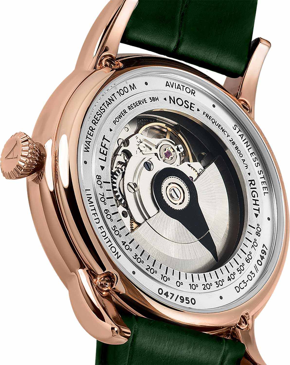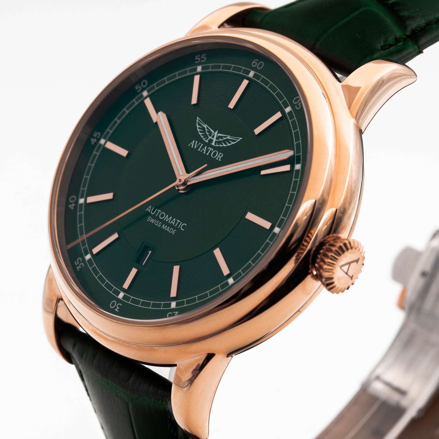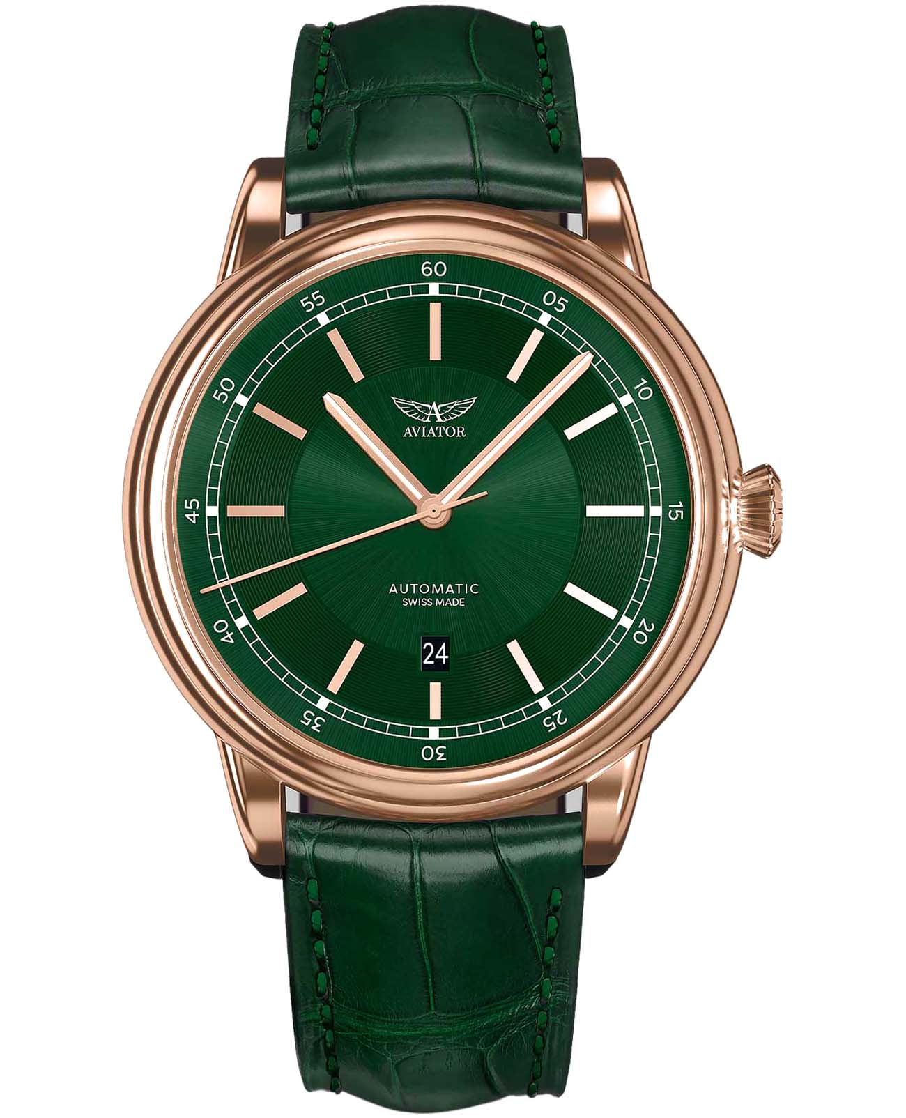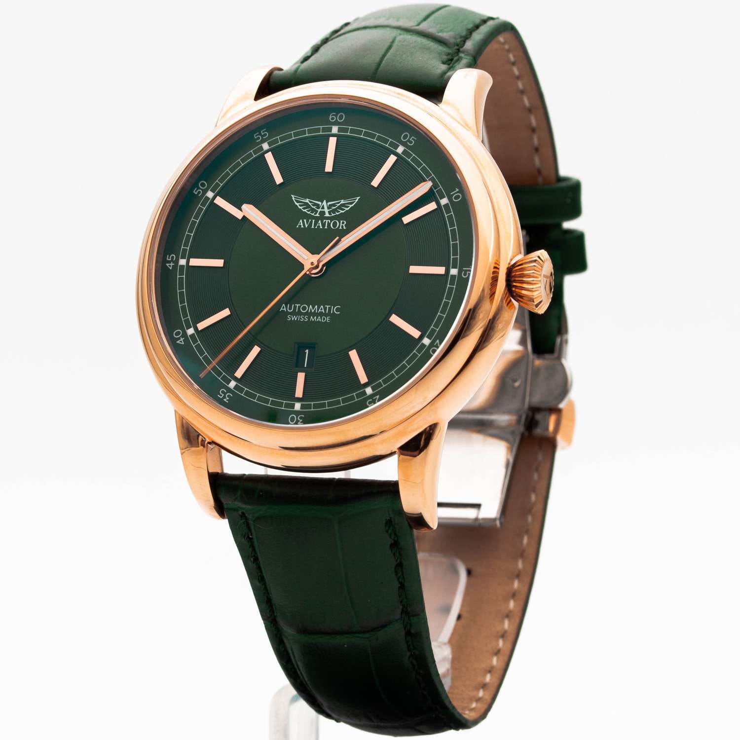 Aviator Douglas DC-3 V.3.32.2.237.4 — швейцарские часы в классике авиадизайна, сочетающие безупречную читаемость и высокую надёжность. Лимитированная серия. Корпус диаметром 45 мм выполнен из нержавеющей стали 316L с PVD-покрытиемPVDУльтратонкое покрытие наносится в технике вакуумного напыления, сочетает в себе нитрид титана особой прочности со слоем золота или оксида хрома. Несёт в себе декоративную или защитную функцию. цвета розового золота. Накладные метки выполнены в виде штрихов. Окошко даты находится в положении 6 часов. Часовые метки и стрелки покрыты люминесцентным покрытиемЛюминесцентное покрытиеПозволяет считывать показания времени в темноте. Производители наносят на стрелки, часовые индексы, безель или поверхность циферблата светонакопительный состав, дающий холодное свечение. Superluminova, позволяющим легко определять время даже в тёмное время суток. Поверхность защищена прочным сапфировым стекломСапфировое стеклоПрочный и надёжный материал из кристалла сапфира синтетического происхождения, характеризующийся особой твёрдостью и устойчивостью к царапинам и повреждениям. с антибликовым покрытием, устойчивым к царапинам. Сердце модели — швейцарский механизм Sellita SW 200, известный своей точностью и долговечностью. Калибр управляется регулятором Etachron , который обеспечивает высокую точность хода как на земле, так и над землей. Водозащита 100 метров, позволит плавать, нырять и заниматься другими водными видами спорта. Завинчивающаяся головка и задняя крышка обеспечивают уверенную ударопрочностьУдаропрочный корпусМеханизм заключён в корпус, выполненный из современных материалов, устойчивых к ударам, механическим повреждениям и падению с высоты: инновационный пластик, карбон, нержавеющая сталь, титан. и надёжную защиту от влаги и пыли. В механизме 26 камней, запас хода 38 часов. Модель дополнена кожаным ремешком с выразительной текстурой и классическим стилем, закреплённым с помощью застёжке-бабочке с кнопкамиЗастёжка "бабочка"Такой вид застёжки дополняется предохранителями, помогающими избежать случайного раскрытия браслета. Обладают изящным исполнением. — для максимального комфорта и лёгкости в повседневном использовании. Циферблат выполнен по технологии sun-ray (солнечные лучи). Коллекция Douglas была разработана в честь известного американского пассажирского самолета Douglas DC-3. Aviator — это образец лётной точности, инженерной чёткости и сдержанной роскоши, идеально подходящий для тех, кто ценит функциональность и уверенность в каждом элементе.