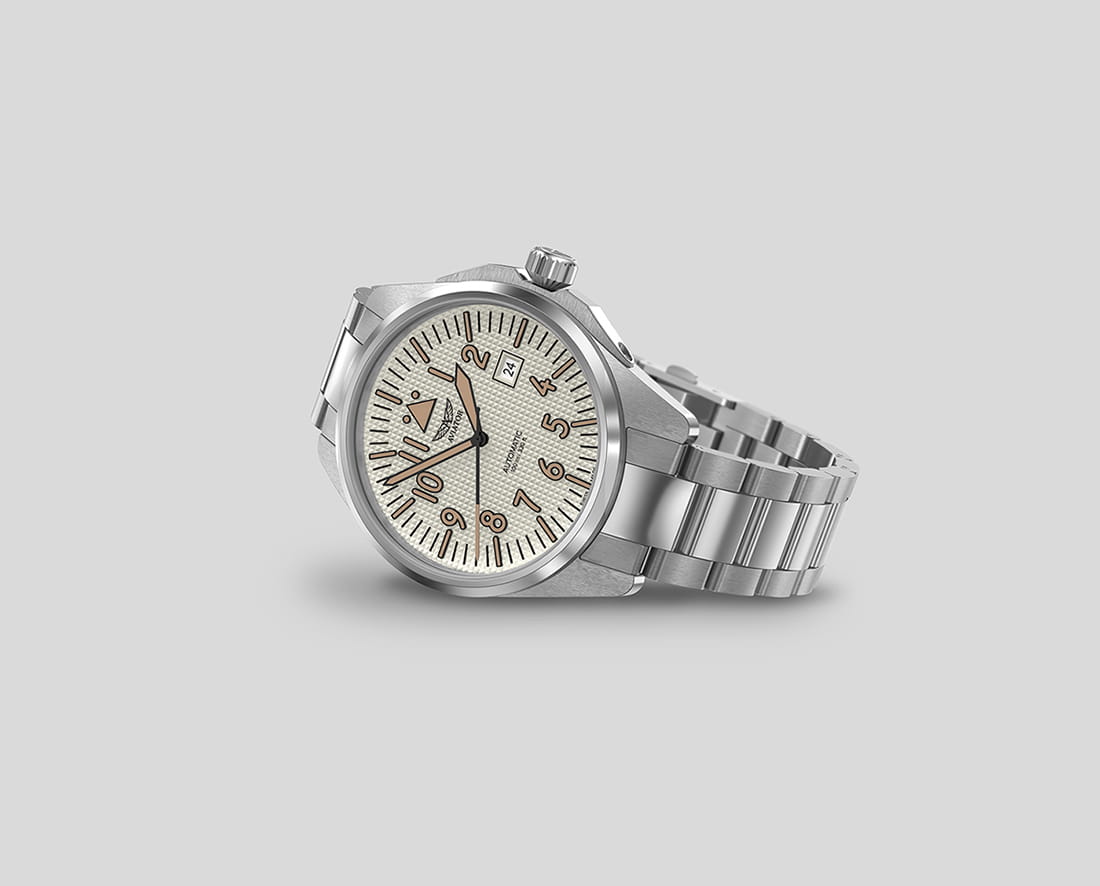 Aviator Airacobra 43 Auto V.3.39.0.336.5 — швейцарские часы в классике авиадизайна, сочетающие безупречную читаемость и высокую надёжность. Корпус диаметром 42,8 мм выполнен из нержавеющей стали 316L. Матовый циферблат с крупными арабскими цифрами, широкими стрелками и контрастной шкалой минут обеспечивает точную и быструю считываемость информации — как и положено настоящим пилотским часам. У отметки «3 часа» — окошко даты. Часовые метки и стрелки покрыты люминесцентным покрытиемЛюминесцентное покрытиеПозволяет считывать показания времени в темноте. Производители наносят на стрелки, часовые индексы, безель или поверхность циферблата светонакопительный состав, дающий холодное свечение. Superluminova, позволяющим легко определять время даже в тёмное время суток. Поверхность защищена прочным сапфировым стекломСапфировое стеклоПрочный и надёжный материал из кристалла сапфира синтетического происхождения, характеризующийся особой твёрдостью и устойчивостью к царапинам и повреждениям. с антибликовым покрытиемАнтибликовое покрытиеСлой оксида металла в 0,13-0,3 микрон, благодаря которому стекло часов не бликует и не отражает свет. Антибликовое покрытие уменьшает отражение света в 10 раз, обеспечивая отличную читаемость показателей циферблата., устойчивым к царапинам. Сердце модели — швейцарский механизм Sellita SW 200-1, известный своей точностью и долговечностью. Водозащита 100 метров, позволит плавать, нырять и заниматься другими водными видами спорта. Завинчивающаяся головка и задняя крышка обеспечивают уверенную ударопрочностьУдаропрочный корпусМеханизм заключён в корпус, выполненный из современных материалов, устойчивых к ударам, механическим повреждениям и падению с высоты: инновационный пластик, карбон, нержавеющая сталь, титан. и надёжную защиту от влаги и пыли. В механизме 26 камней, запас хода до 38 часов. Модель дополнена стальным браслетом на раскладной застёжкеРаскладная застёжкаТакой тип застёжки используется только на браслетах из металла. Она никогда не раскрывается полностью, происходит разделение на 2 и более частей. Раскладывающая застёжка снизит вероятность потери часов к минимуму. — для максимального комфорта и лёгкости в повседневном использовании. Aviator — это образец лётной точности, инженерной чёткости и сдержанной роскоши, идеально подходящий для тех, кто ценит функциональность и уверенность в каждом элементе. Лимитированная серия.