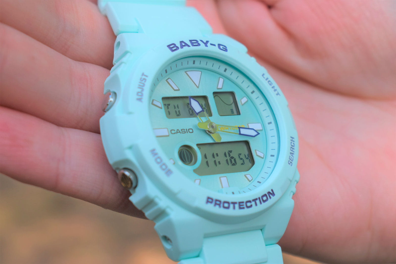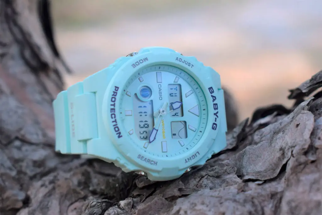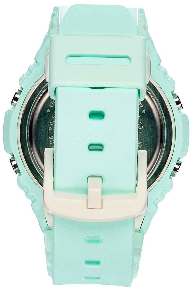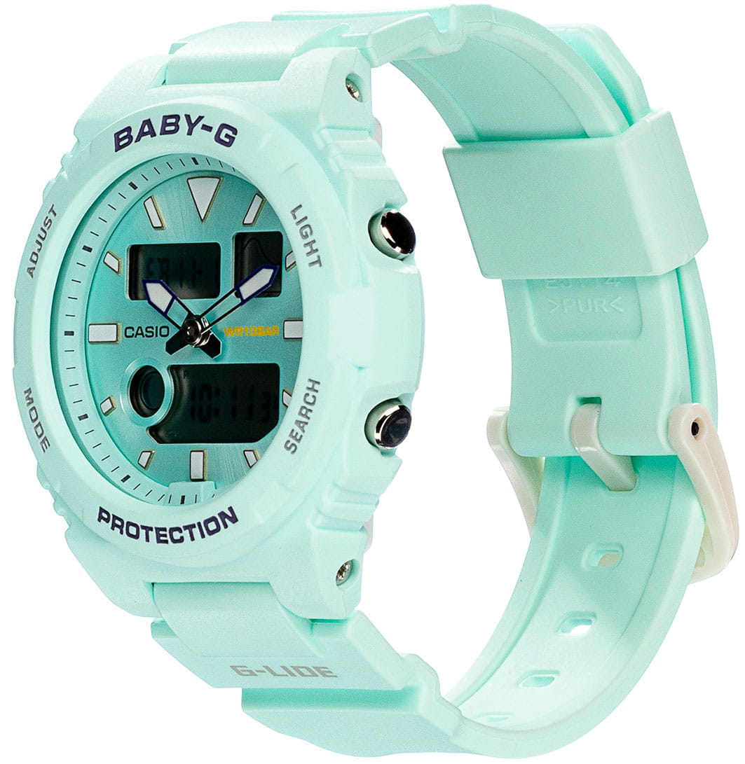 Аксессуар серии G-Lide отражает стиль 90-х годов, привлекательно смотрятся контрастные элементы оформления на фоне мятного оттенка. Это идеальный вариант для дополнения спортивного или повседневного образа. Противоударный корпусУдаропрочный корпусМеханизм заключён в корпус, выполненный из современных материалов, устойчивых к ударам, механическим повреждениям и падению с высоты: инновационный пластик, карбон, нержавеющая сталь, титан. из полимерного материала защищает «начинку» часов от ударов, повреждений, падения. Японский кварцевый механизм с абсолютной точностью хода. Аккумулятор рассчитан на 3 года работы. Дополнительный циферблат мирового времениМировое время Полезное часовое усложнение, отображающее время в основных городах и известных областях по всему миру, оно связано с часовыми поясами, удобно для путешественников и бизнесменов. . Минеральное стеклоМинеральное стеклоМинеральное стекло представляет собой искусственно выращенный минерал кварца. Такое стекло отличается особой устойчивостью к повреждениям и царапинам. Уступает по некоторым качествам сапфировому стеклу. устойчивое к мелким механическим повреждениям. Водонепроницаемость 10 бар. Автоматическая светодиодная подсветкаСветодиодная подсветкаСветодиодная или LED-подсветка обеспечивает появление яркого холодного свечения за счёт LED-элементов - маленьких лампочек. Они потребляют минимальное количество энергии, чаще всего можно встретить 1 светодиод, в нижней части циферблата.. БудильникБудильникБуди́льник — часы, в заданный момент времени подающие звуковой, световой и/или в редких случаях другой сигнал. с функцией «подремать», автоматический календарь. Подсветка NeobriteПодсветка NeobriteИспользование светонакопительных составов на основе сульфида цинка или алюмината стронция, яркий свет можно наблюдать на протяжении 6-10 часов после «зарядки» часов около источника света. обеспечивает длительное послесвечение в темноте даже после кратковременного нахождения на свету. - при повороте часов в сторону лица подсветка дисплея осуществляется автоматически. Отображение возраста и фазы Луны. Отображение сведений о приливах и отливах на заданную дату и время даже в режиме хронометража. При каждом нажатии на кнопку напротив 4-х часов можно почасово отследить будущий уровень волны в определенном месте. СекундомерСекундомерСекундоме́р — прибор, способный измерять интервалы времени с точностью до долей секунды. с точностью показаний 1/100с и временем измерения 24ч. Сплит-хронографСплит-хронографИспользуется для измерения продолжительности нескольких временных отрезков, начинающихся одновременно, а заканчивающихся в разное время.. ТаймерТаймерОтсчитывает секунды в обратном направлении в заданном интервале времени. обратного отсчета от 1/1сек до 24ч с автоповтором. 12-ти и 24-х часовой формат времени. Типы сигналов: ежедневный, ежемесячный, каждый день определенного месяца, на определенную дату. Функция отключения/включения звука. Габариты: 46,1 x 42,4 x 12,3 мм.