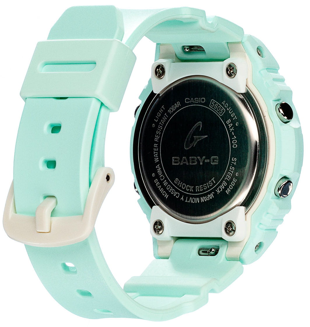 Женские японские часы Casio Baby-G G-Lide BAX-100-3AER c хронографомХронографФункция позволяет измерять отрезки времени с особой точностью: часы, минуты, секунды. Верным признаком хронографа является наличие на циферблате 3 дополнительных окошек-счётчиков. из коллекции Baby-G выпущены специально для любительниц сёрфинга и больших волн.