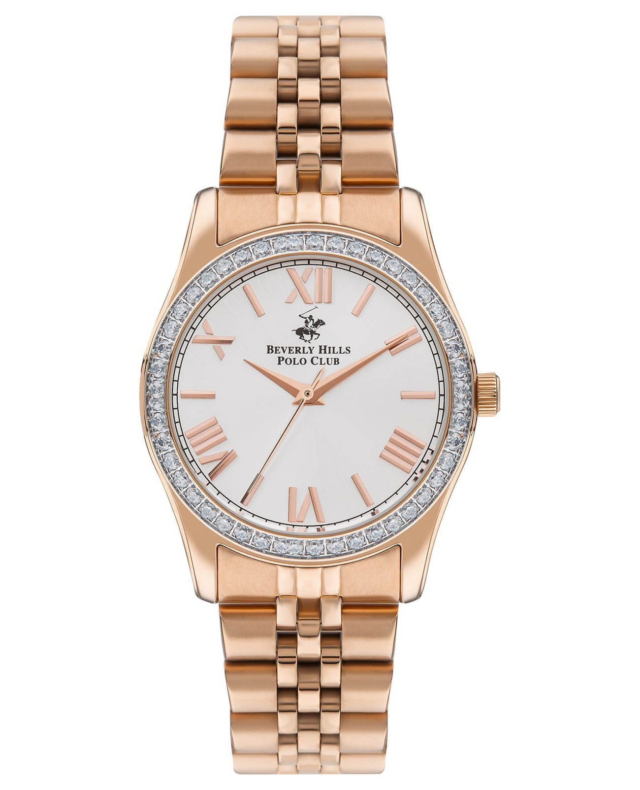 Американские женские часы с минеральным стекломМинеральное стеклоМинеральное стекло представляет собой искусственно выращенный минерал кварца. Такое стекло отличается особой устойчивостью к повреждениям и царапинам. Уступает по некоторым качествам сапфировому стеклу. Beverly Hills Polo Club BP3383C.430, кварцевый механизм с высокой точностью. Корпус и браслет часов изготовлены из нержавеющей стали с IP-покрытиемIP-покрытиеМетод ионного напыления. Демонстрирует повышенную устойчивость к истиранию, окислению и химическим веществам. Под воздействием высокого давления и температуры около 1500°C молекулы металла надёжно соединяются с частицами корпуса часов.. НеподвижныйбезельБезельВнешний ободок, закрепляющий стекло. В спортивных часах так называется поворотное кольцо с делениями на циферблате, выполняет роль таймера – замеряет отрезки времени на шкале. Неподвижный безель – элемент декора. Однонаправленно вращающийся безель на дайверских часах позволяет фиксировать моменты погружения и выныривания на поверхность. из нержавеющей стали с IP-покрытиемIP-покрытиеМетод ионного напыления. Демонстрирует повышенную устойчивость к истиранию, окислению и химическим веществам. Под воздействием высокого давления и температуры около 1500°C молекулы металла надёжно соединяются с частицами корпуса часов. украшен кристаллами. Класс водозащиты: 50 метров, позволит защитить корпус от случайных брызг или капель дождя. Стальной браслет на раскладной застёжкеРаскладная застёжкаТакой тип застёжки используется только на браслетах из металла. Она никогда не раскрывается полностью, происходит разделение на 2 и более частей. Раскладывающая застёжка снизит вероятность потери часов к минимуму..