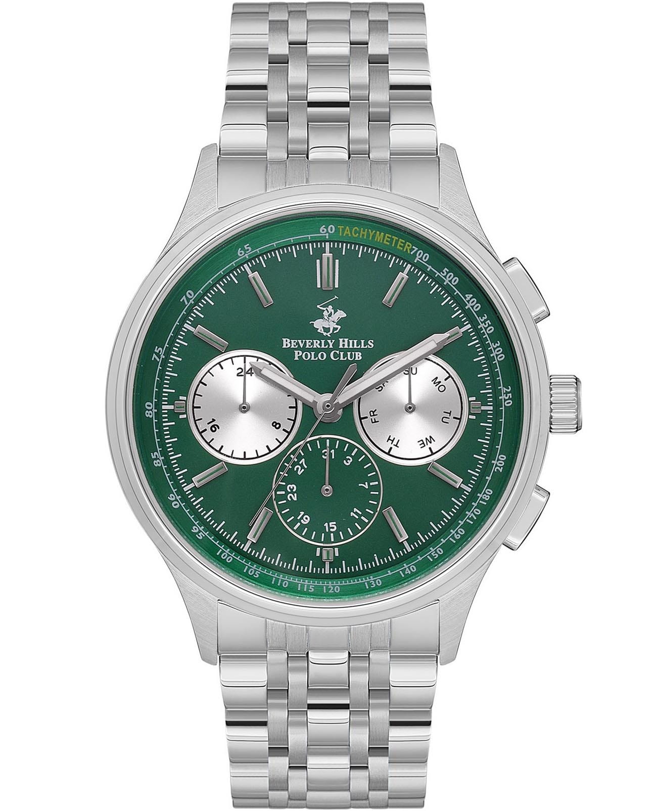 Американские мужские часы Beverly Hills Polo Club BP3556X.370 с надёжным кварцевым механизмом. Минеральное стеклоМинеральное стеклоМинеральное стекло представляет собой искусственно выращенный минерал кварца. Такое стекло отличается особой устойчивостью к повреждениям и царапинам. Уступает по некоторым качествам сапфировому стеклу. устойчивое к появлению царапин, обладающее высокой прозрачностью. Класс водозащиты: 50 метров, позволит защитить корпус от случайных брызг или капель дождя. Корпус часов изготовлен из стали. Стальной браслет на раскладной застёжкеРаскладная застёжкаТакой тип застёжки используется только на браслетах из металла. Она никогда не раскрывается полностью, происходит разделение на 2 и более частей. Раскладывающая застёжка снизит вероятность потери часов к минимуму.. Стрелки и метки с люминесцентным покрытиемЛюминесцентное покрытиеПозволяет считывать показания времени в темноте. Производители наносят на стрелки, часовые индексы, безель или поверхность циферблата светонакопительный состав, дающий холодное свечение.. Дата, день недели и 24-х часовой формат времени на дополнительных циферблатах. Циферблат со шкалой тахиметраТахиметрРазмеченная шкала, располагается на ободке или безеле часов. Тахиметр позволяет рассчитать скорость на определённом участке пути, расстояние измеряется в километрах или милях..