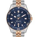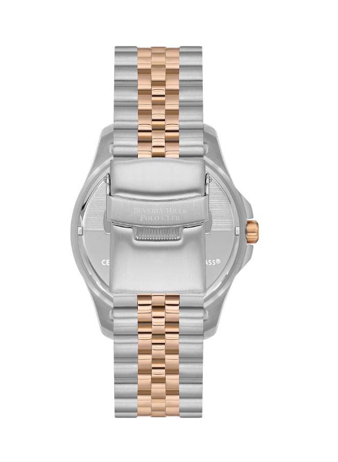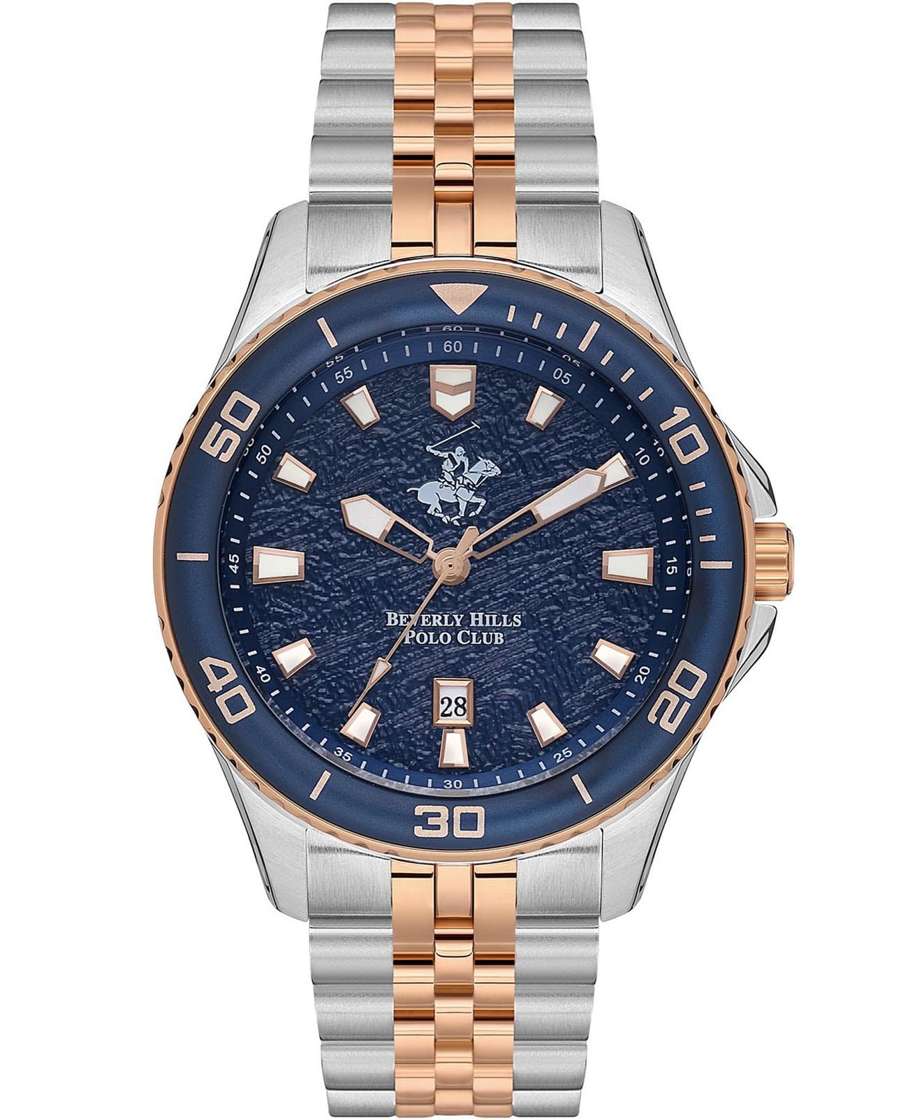 Мужские наручные часы Beverly Hills Polo Club BP3559X.590 с надёжным кварцевым механизмом. Минеральное стеклоМинеральное стеклоМинеральное стекло представляет собой искусственно выращенный минерал кварца. Такое стекло отличается особой устойчивостью к повреждениям и царапинам. Уступает по некоторым качествам сапфировому стеклу. устойчивое к мелким механическим повреждениям. Корпус часов изготовлен из нержавеющей стали. Стальной браслет с частичным IP-покрытиемIP-покрытиеМетод ионного напыления. Демонстрирует повышенную устойчивость к истиранию, окислению и химическим веществам. Под воздействием высокого давления и температуры около 1500°C молекулы металла надёжно соединяются с частицами корпуса часов. на раскладной застёжкеРаскладная застёжкаТакой тип застёжки используется только на браслетах из металла. Она никогда не раскрывается полностью, происходит разделение на 2 и более частей. Раскладывающая застёжка снизит вероятность потери часов к минимуму.. Вращающийся стальной безельБезельВнешний ободок, закрепляющий стекло. В спортивных часах так называется поворотное кольцо с делениями на циферблате, выполняет роль таймера – замеряет отрезки времени на шкале. Неподвижный безель – элемент декора. Однонаправленно вращающийся безель на дайверских часах позволяет фиксировать моменты погружения и выныривания на поверхность. с IP-покрытиемIP-покрытиеМетод ионного напыления. Демонстрирует повышенную устойчивость к истиранию, окислению и химическим веществам. Под воздействием высокого давления и температуры около 1500°C молекулы металла надёжно соединяются с частицами корпуса часов.. Стрелки и метки с люминесцентным покрытиемЛюминесцентное покрытиеПозволяет считывать показания времени в темноте. Производители наносят на стрелки, часовые индексы, безель или поверхность циферблата светонакопительный состав, дающий холодное свечение.. Класс водозащиты: 100 метров, позволит плавать, нырять и заниматься другими водными видами спорта.