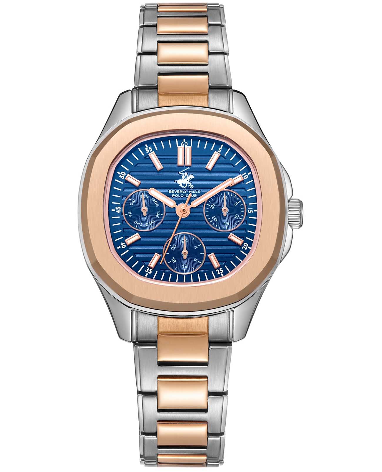Beverly Hills Polo Club BP3700C.590 – элегантные женские часы, сочетающие стильный дизайн и высокую функциональность. Корпус диаметром 34 мм выполнен из суперметалла, обеспечивающего прочность и долговечность. Циферблат украшен, и защищён минеральным стекломМинеральное стеклоМинеральное стекло представляет собой искусственно выращенный минерал кварца. Такое стекло отличается особой устойчивостью к повреждениям и царапинам. Уступает по некоторым качествам сапфировому стеклу., устойчивым к царапинам. БезельБезельВнешний ободок, закрепляющий стекло. В спортивных часах так называется поворотное кольцо с делениями на циферблате, выполняет роль таймера – замеряет отрезки времени на шкале. Неподвижный безель – элемент декора. Однонаправленно вращающийся безель на дайверских часах позволяет фиксировать моменты погружения и выныривания на поверхность. с PVD-покрытиемPVDУльтратонкое покрытие наносится в технике вакуумного напыления, сочетает в себе нитрид титана особой прочности со слоем золота или оксида хрома. Несёт в себе декоративную или защитную функцию.. Часы оснащены точным кварцевым механизмом, гарантирующим надёжное отображение времени. Браслет из нержавеющей стали с PVD-покрытиемPVDУльтратонкое покрытие наносится в технике вакуумного напыления, сочетает в себе нитрид титана особой прочности со слоем золота или оксида хрома. Несёт в себе декоративную или защитную функцию. на застёжке-бабочке с кнопкамиЗастёжка "бабочка"Такой вид застёжки дополняется предохранителями, помогающими избежать случайного раскрытия браслета. Обладают изящным исполнением. , обеспечивающей комфортное ношение и надёжную фиксацию на запястье. Водозащита до 50 метров (5 ATM) позволяет использовать часы в повседневной жизни, включая кратковременное погружение в воду.