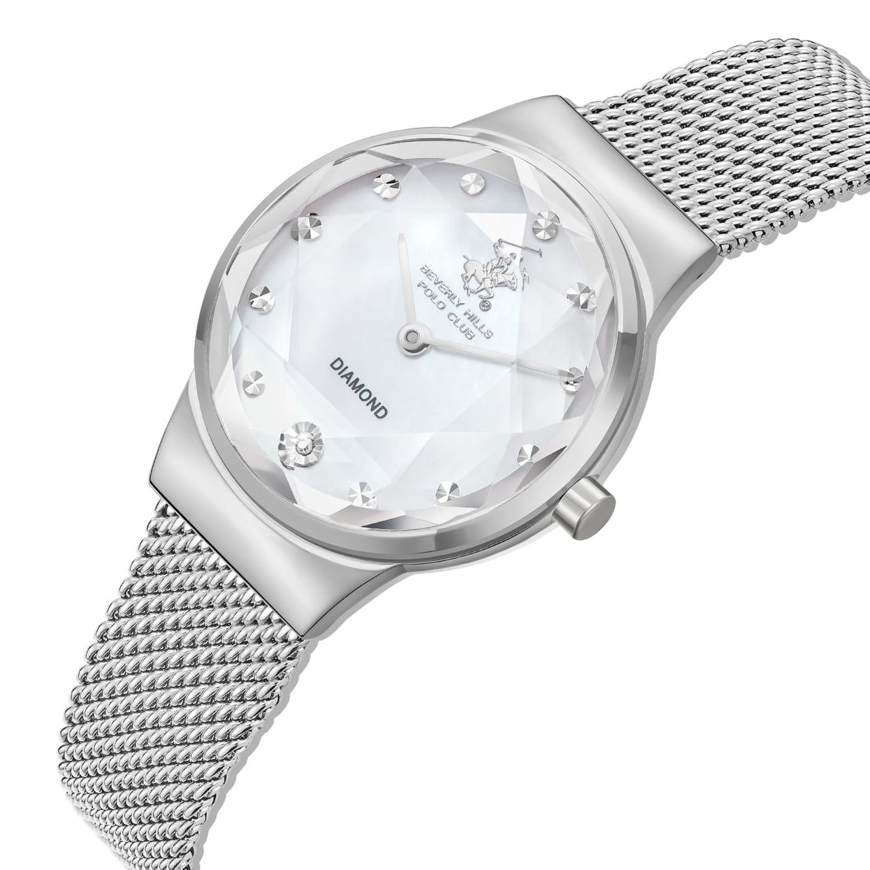 Американские женские часы Beverly Hills Polo Club BP3768X.320 - это стильный женский аксессуар, который сочетает элегантный дизайн и практичность. Корпус выполнен из нержавеющей стали диаметром 28 мм, что обеспечивает долговечность и утончённый внешний вид. Надежное минеральное стеклоМинеральное стеклоМинеральное стекло представляет собой искусственно выращенный минерал кварца. Такое стекло отличается особой устойчивостью к повреждениям и царапинам. Уступает по некоторым качествам сапфировому стеклу. с сапфировым покрытием защищает циферблат от царапин и обеспечивает долговечность. Метки в виде точек инкрустированы синтетическими бриллиантами. Модель оснащена кварцевым механизмом, обеспечивающим высокую точность хода. Стальной браслет миланского плетения на раскладной застёжкеРаскладная застёжкаТакой тип застёжки используется только на браслетах из металла. Она никогда не раскрывается полностью, происходит разделение на 2 и более частей. Раскладывающая застёжка снизит вероятность потери часов к минимуму. обеспечивает комфортное ношение. Водозащита 30 метров позволит защитить корпус от случайных брызг или капель дождя. Эта модель – отличный выбор для тех, кто ищет сочетание стиля, качества и функциональности. Часы станут не только полезным аксессуаром, но и выразительным элементом вашего имиджа.