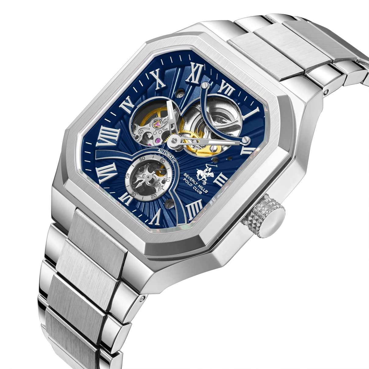 Мужские механические часы с автоподзаводом Beverly Hills Polo Club — это идеальное сочетание силы, стиля и современных технологий. Корпус диаметром 40 мм выполнен из стали 316L и имеет форму квадрата со срезанными углами. Циферблат синего цвета частично скелетонизированный, оформлен римскими цифрами и стрелками. Секундная стрелка вынесена на отдельный субциферблат. Циферблат защищён минеральным стекломМинеральное стеклоМинеральное стекло представляет собой искусственно выращенный минерал кварца. Такое стекло отличается особой устойчивостью к повреждениям и царапинам. Уступает по некоторым качествам сапфировому стеклу. с сапфировым покрытием. Заводная головка завинчивающаяся, что повышает надёжность. Часы оснащены стальным браслетом на застёжке «бабочка» с кнопкамиЗастёжка "бабочка"Такой вид застёжки дополняется предохранителями, помогающими избежать случайного раскрытия браслета. Обладают изящным исполнением. . Водонепроницаемость 50 м позволяет использовать часы при мытье рук или в дождь. Идеальный выбор для тех, кто ценит американское качество и универсальный дизайн.