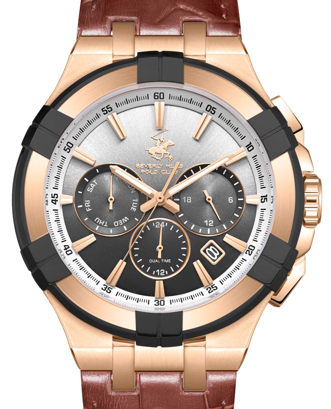 Американские мужские часы Beverly Hills Polo Club BP3803X.455 - это стильный мужской аксессуар, который сочетает элегантный дизайн и практичность. Корпус выполнен из нержавеющей стали с IP-покрытиемIP-покрытиеМетод ионного напыления. Демонстрирует повышенную устойчивость к истиранию, окислению и химическим веществам. Под воздействием высокого давления и температуры около 1500°C молекулы металла надёжно соединяются с частицами корпуса часов. цвета розового золота, диаметром 44 мм, что обеспечивает долговечность и утончённый внешний вид. Надежное минеральное стеклоМинеральное стеклоМинеральное стекло представляет собой искусственно выращенный минерал кварца. Такое стекло отличается особой устойчивостью к повреждениям и царапинам. Уступает по некоторым качествам сапфировому стеклу. с сапфировым покрытием защищает циферблат от царапин и обеспечивает долговечность. Неподвижный безельБезельВнешний ободок, закрепляющий стекло. В спортивных часах так называется поворотное кольцо с делениями на циферблате, выполняет роль таймера – замеряет отрезки времени на шкале. Неподвижный безель – элемент декора. Однонаправленно вращающийся безель на дайверских часах позволяет фиксировать моменты погружения и выныривания на поверхность. с IP-покрытиемIP-покрытиеМетод ионного напыления. Демонстрирует повышенную устойчивость к истиранию, окислению и химическим веществам. Под воздействием высокого давления и температуры около 1500°C молекулы металла надёжно соединяются с частицами корпуса часов. черно-золотого цвета. Модель оснащена кварцевым механизмом, обеспечивающим высокую точность хода. Кожаный ремешок на стандартной застёжке обеспечивает комфортное ношение. Окошко даты находится в положении между 4 и 5 часов. Стрелки с люминесцентным покрытиемЛюминесцентное покрытиеПозволяет считывать показания времени в темноте. Производители наносят на стрелки, часовые индексы, безель или поверхность циферблата светонакопительный состав, дающий холодное свечение. позволяют легко считывать время даже в условиях недостаточного освещения. Водозащита 50 метров позволит защитить корпус от случайных брызг или капель дождя. Эта модель – отличный выбор для тех, кто ищет сочетание стиля, качества и функциональности. Часы станут не только полезным аксессуаром, но и выразительным элементом вашего имиджа.