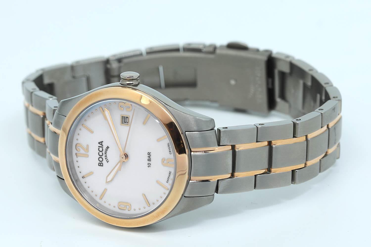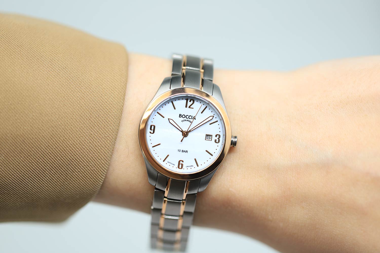 Женские наручные часы Boccia Titanium 3317-02 с надёжным кварцевым механизмом. Корпус и браслет часов изготовлены из титана. Сапфировое стеклоСапфировое стеклоПрочный и надёжный материал из кристалла сапфира синтетического происхождения, характеризующийся особой твёрдостью и устойчивостью к царапинам и повреждениям. устойчивое к мелким механическим повреждениям. Класс водозащиты: 100 метров, позволит плавать, нырять и заниматься другими водными видами спорта. Титановый браслет с частичным PVD-покрытиемPVDУльтратонкое покрытие наносится в технике вакуумного напыления, сочетает в себе нитрид титана особой прочности со слоем золота или оксида хрома. Несёт в себе декоративную или защитную функцию. на раскладной застёжкеРаскладная застёжкаТакой тип застёжки используется только на браслетах из металла. Она никогда не раскрывается полностью, происходит разделение на 2 и более частей. Раскладывающая застёжка снизит вероятность потери часов к минимуму.. Окошко даты находится в положении 3 часа. Стрелки с люминесцентным покрытиемЛюминесцентное покрытиеПозволяет считывать показания времени в темноте. Производители наносят на стрелки, часовые индексы, безель или поверхность циферблата светонакопительный состав, дающий холодное свечение..