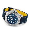 Класс водозащиты: 300 метров, позволит плавать, нырять и заниматься другими водными видами спорта. Корпус часов изготовлен из нержавеющей стали, серебристого цвета. Синий ремешок из телячьей кожи с кнопочной застежкой.