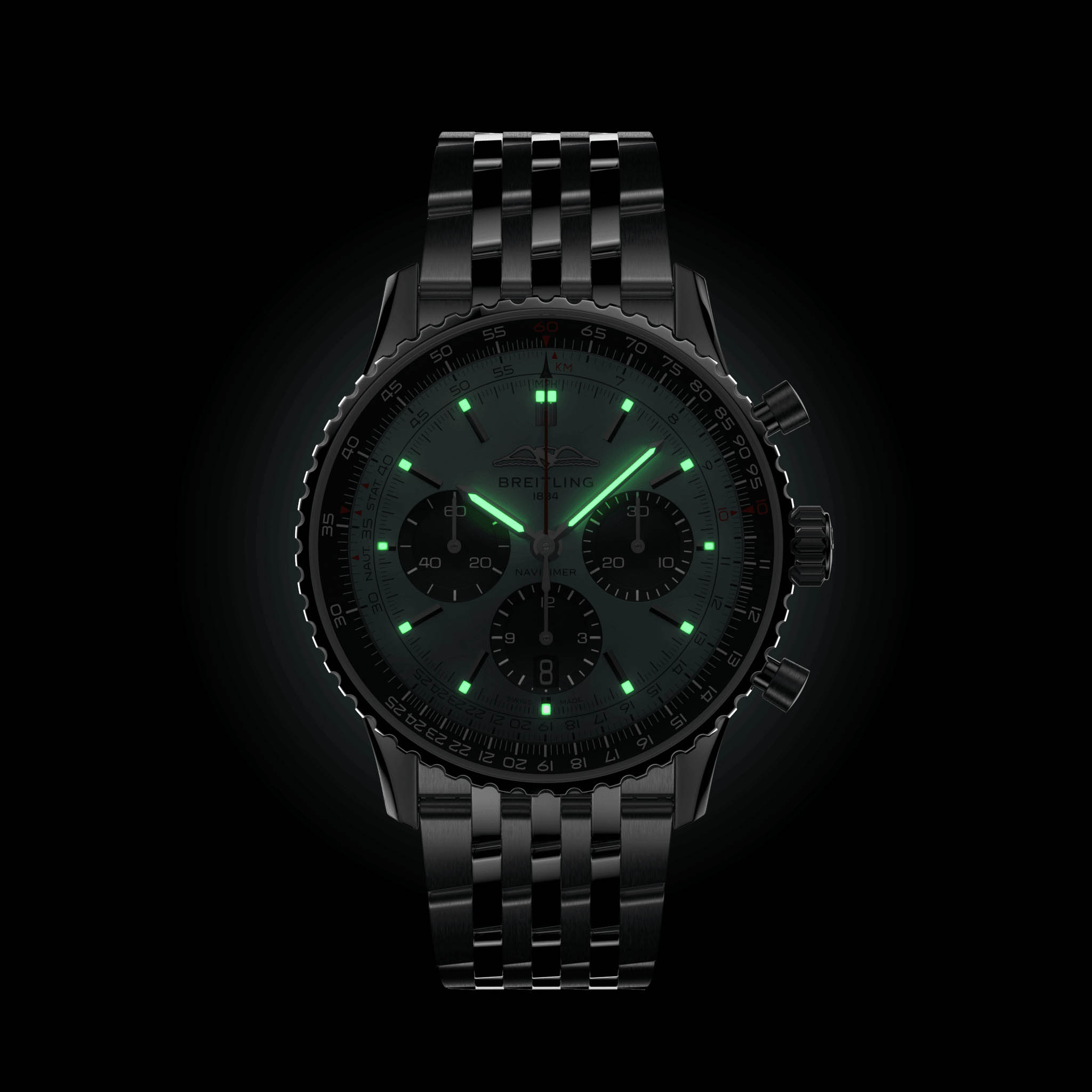 Мужские швейцарские часы-хронографХронографФункция позволяет измерять отрезки времени с особой точностью: часы, минуты, секунды. Верным признаком хронографа является наличие на циферблате 3 дополнительных окошек-счётчиков. с секундомеромСекундомерСекундоме́р — прибор, способный измерять интервалы времени с точностью до долей секунды. Breitling Navitimer B01 Chronograph 43 AB0138241C1A1, механический механизм (автоматический калибр) с высокой точностью. Сапфировое стеклоСапфировое стеклоПрочный и надёжный материал из кристалла сапфира синтетического происхождения, характеризующийся особой твёрдостью и устойчивостью к царапинам и повреждениям. с антибликовым покрытием устойчивое к появлению царапин, обладающее высокой прозрачностью. Класс водозащиты: 30 метров, позволит защитить корпус от случайных брызг или капель дождя. Корпус часов изготовлен из стали. Стальной браслет с застёжкой-бабочкой с кнопкамиЗастёжка "бабочка"Такой вид застёжки дополняется предохранителями, помогающими избежать случайного раскрытия браслета. Обладают изящным исполнением. . Шкала тахиметраТахиметрРазмеченная шкала, располагается на ободке или безеле часов. Тахиметр позволяет рассчитать скорость на определённом участке пути, расстояние измеряется в километрах или милях. на циферблате. Часы имеют сертификат COSCСертификат COSCОфициальный сертификат, подтверждающий то, что часы ходят с особо высокой точностью. Для получения документа часы подвергаются тестовым испытаниям, разработанным швейцарским институтом тестирования хронометров COSC. Допустимая норма для механических часов -4/+6 секунд в день, для кварцевых моделей +/- 0,07 секунд в день.. Окошко даты находится в положении 6 часов. Стрелки и метки с люминесцентным покрытиемЛюминесцентное покрытиеПозволяет считывать показания времени в темноте. Производители наносят на стрелки, часовые индексы, безель или поверхность циферблата светонакопительный состав, дающий холодное свечение..