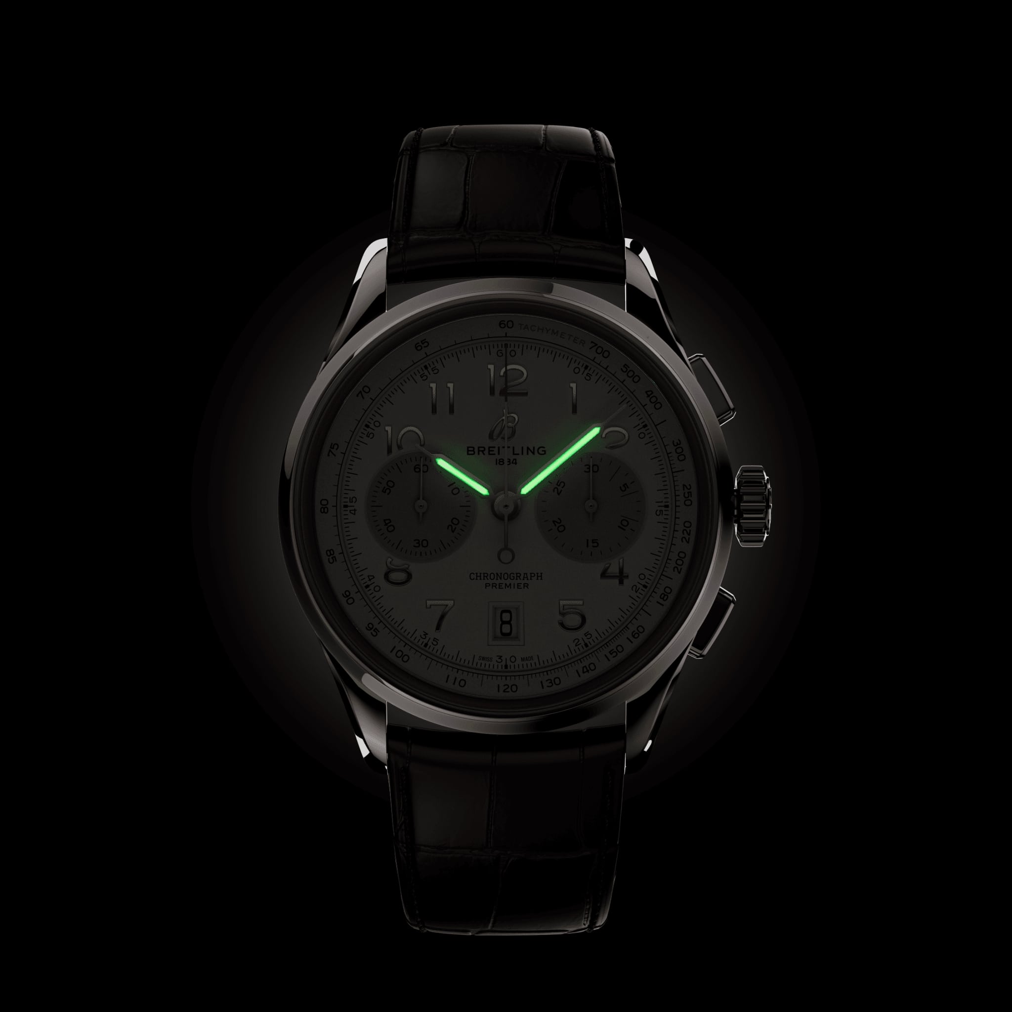 Мужские швейцарские часы-хронографХронографФункция позволяет измерять отрезки времени с особой точностью: часы, минуты, секунды. Верным признаком хронографа является наличие на циферблате 3 дополнительных окошек-счётчиков. с тахиметромТахиметрРазмеченная шкала, располагается на ободке или безеле часов. Тахиметр позволяет рассчитать скорость на определённом участке пути, расстояние измеряется в километрах или милях. Breitling Premier B01 Chronograph 42 AB0145211G1P2, механический механизм (автоматический калибр) с высокой точностью. Сапфировое стеклоСапфировое стеклоПрочный и надёжный материал из кристалла сапфира синтетического происхождения, характеризующийся особой твёрдостью и устойчивостью к царапинам и повреждениям. с антибликовым покрытием устойчивое к появлению царапин, обладающее высокой прозрачностью. Класс водозащиты: 100 метров, позволит плавать, нырять и заниматься другими водными видами спорта. Корпус часов изготовлен из стали. Кожаный крокодиловый ремешок с раскладной застёжкойРаскладная застёжкаТакой тип застёжки используется только на браслетах из металла. Она никогда не раскрывается полностью, происходит разделение на 2 и более частей. Раскладывающая застёжка снизит вероятность потери часов к минимуму.. Стрелки с люминесцентным покрытиемЛюминесцентное покрытиеПозволяет считывать показания времени в темноте. Производители наносят на стрелки, часовые индексы, безель или поверхность циферблата светонакопительный состав, дающий холодное свечение.. Окошко даты находится в положении 6 часов. СекундомерСекундомерСекундоме́р — прибор, способный измерять интервалы времени с точностью до долей секунды..
