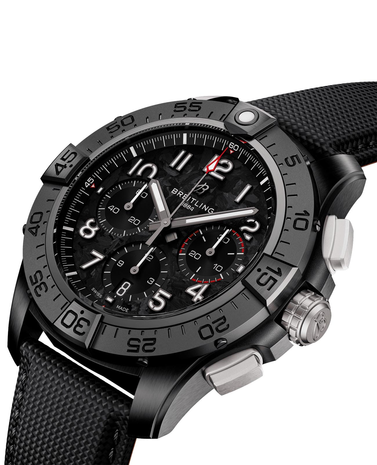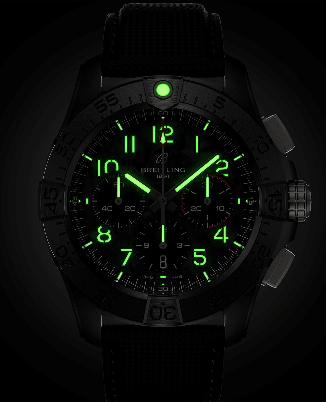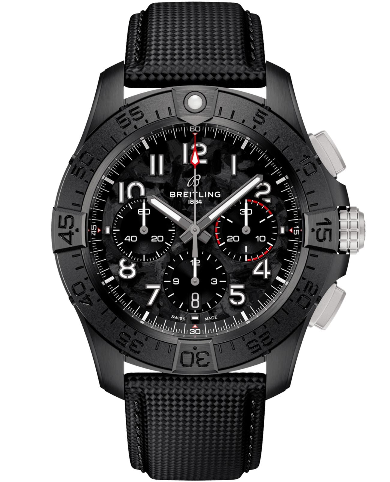 Мужские наручные часы c хронографомХронографФункция позволяет измерять отрезки времени с особой точностью: часы, минуты, секунды. Верным признаком хронографа является наличие на циферблате 3 дополнительных окошек-счётчиков. Breitling Avenger B01 Chronograph 44 Night Mission SB0147101B1X1 с надёжным автоматическим механизмом. Корпус часов изготовлен из керамики. Сапфировое стеклоСапфировое стеклоПрочный и надёжный материал из кристалла сапфира синтетического происхождения, характеризующийся особой твёрдостью и устойчивостью к царапинам и повреждениям. с антибликовым покрытием, устойчивое к мелким механическим повреждениям. Практичный кожаный ремешок на стандартной застёжке. Стрелки и метки с люминесцентным покрытиемЛюминесцентное покрытиеПозволяет считывать показания времени в темноте. Производители наносят на стрелки, часовые индексы, безель или поверхность циферблата светонакопительный состав, дающий холодное свечение.. Однонаправленный керамический безельБезельВнешний ободок, закрепляющий стекло. В спортивных часах так называется поворотное кольцо с делениями на циферблате, выполняет роль таймера – замеряет отрезки времени на шкале. Неподвижный безель – элемент декора. Однонаправленно вращающийся безель на дайверских часах позволяет фиксировать моменты погружения и выныривания на поверхность..