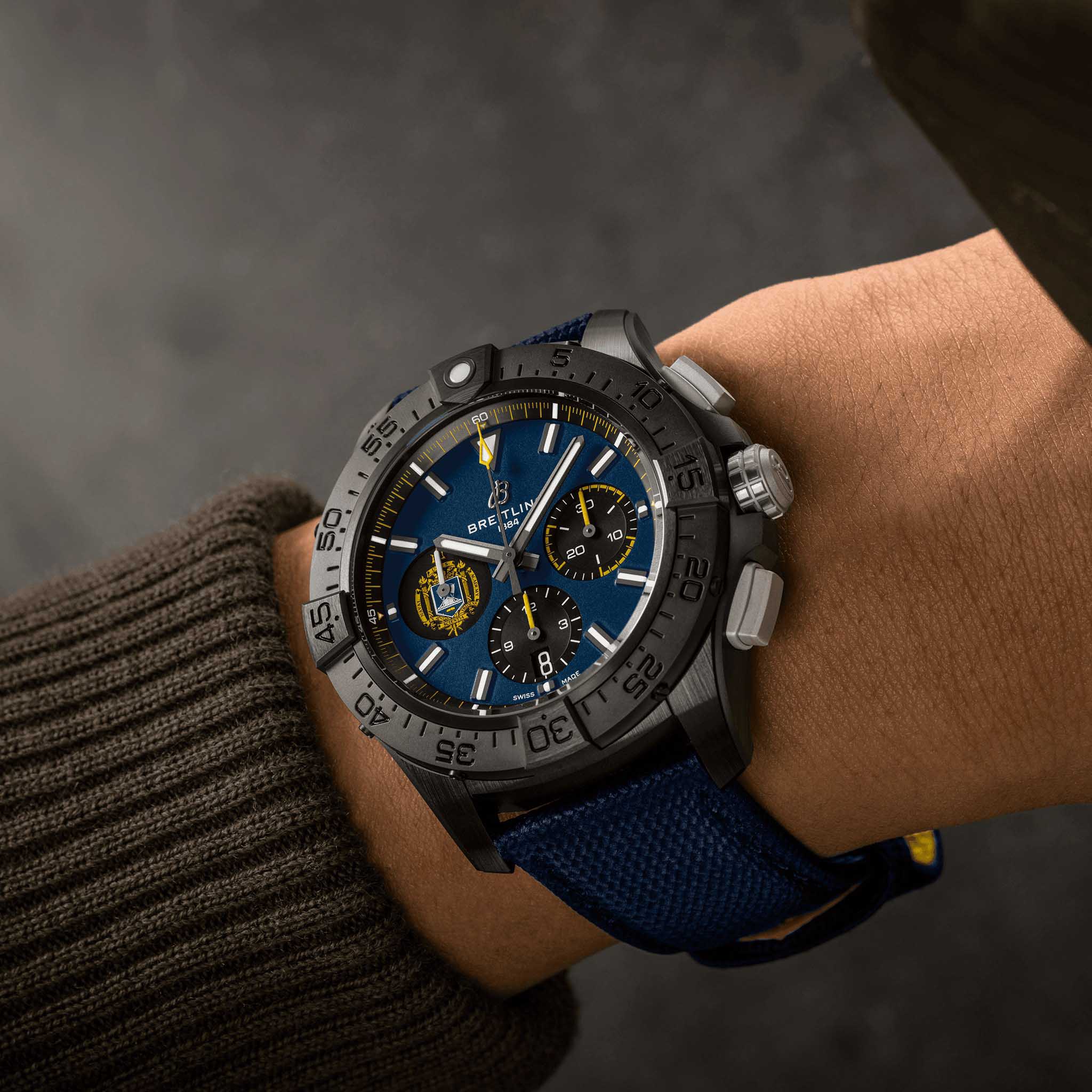 Мужские швейцарские часы-хронографХронографФункция позволяет измерять отрезки времени с особой точностью: часы, минуты, секунды. Верным признаком хронографа является наличие на циферблате 3 дополнительных окошек-счётчиков. с автоподзаводом Breitling Avenger B01 Chronograph 44 Night Mission Us Naval Academy SB01474A1C1X1. Сапфировое стеклоСапфировое стеклоПрочный и надёжный материал из кристалла сапфира синтетического происхождения, характеризующийся особой твёрдостью и устойчивостью к царапинам и повреждениям. устойчивое к появлению царапин, обладающее высокой прозрачностью. Класс водозащиты: 300 метров, позволит плавать, нырять и заниматься другими водными видами спорта. Корпус часов изготовлен из керамики. Стрелки и метки с люминесцентным покрытиемЛюминесцентное покрытиеПозволяет считывать показания времени в темноте. Производители наносят на стрелки, часовые индексы, безель или поверхность циферблата светонакопительный состав, дающий холодное свечение.. Шкала тахиметра на циферблате. Окошко даты находится в положении 6 часов. Кожаный ремешок на раскладной застёжкеРаскладная застёжкаТакой тип застёжки используется только на браслетах из металла. Она никогда не раскрывается полностью, происходит разделение на 2 и более частей. Раскладывающая застёжка снизит вероятность потери часов к минимуму..