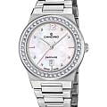 Женские кварцевые часы Candino из коллекции Lady Elegance — это элегантный аксессуар швейцарского производства, сочетающий изысканный дизайн и надёжность. Корпус круглой формы выполнен из стали серебряного цвета и защищён сапфировым стекломСапфировое стеклоПрочный и надёжный материал из кристалла сапфира синтетического происхождения, характеризующийся особой твёрдостью и устойчивостью к царапинам и повреждениям.. Безель украшен кристаллами, подчёркивая роскошь модели. Циферблат перламутрового цвета оформлен точками в качестве индикации, окошко даты расположено на отметке 6 часов. Стрелки и метки оснащены люминесцентным покрытиемЛюминесцентное покрытиеПозволяет считывать показания времени в темноте. Производители наносят на стрелки, часовые индексы, безель или поверхность циферблата светонакопительный состав, дающий холодное свечение. Luminova, обеспечивающим хорошую читаемость в темноте. Браслет из стали серебряного цвета фиксируется на раскладной застёжкеРаскладная застёжкаТакой тип застёжки используется только на браслетах из металла. Она никогда не раскрывается полностью, происходит разделение на 2 и более частей. Раскладывающая застёжка снизит вероятность потери часов к минимуму.. Водонепроницаемость составляет 50 WR, что позволяет использовать часы в повседневных условиях, защищая от случайных брызг и капель дождя. Модель идеально подходит для повседневного ношения, подчёркивая утончённый стиль и женственность.