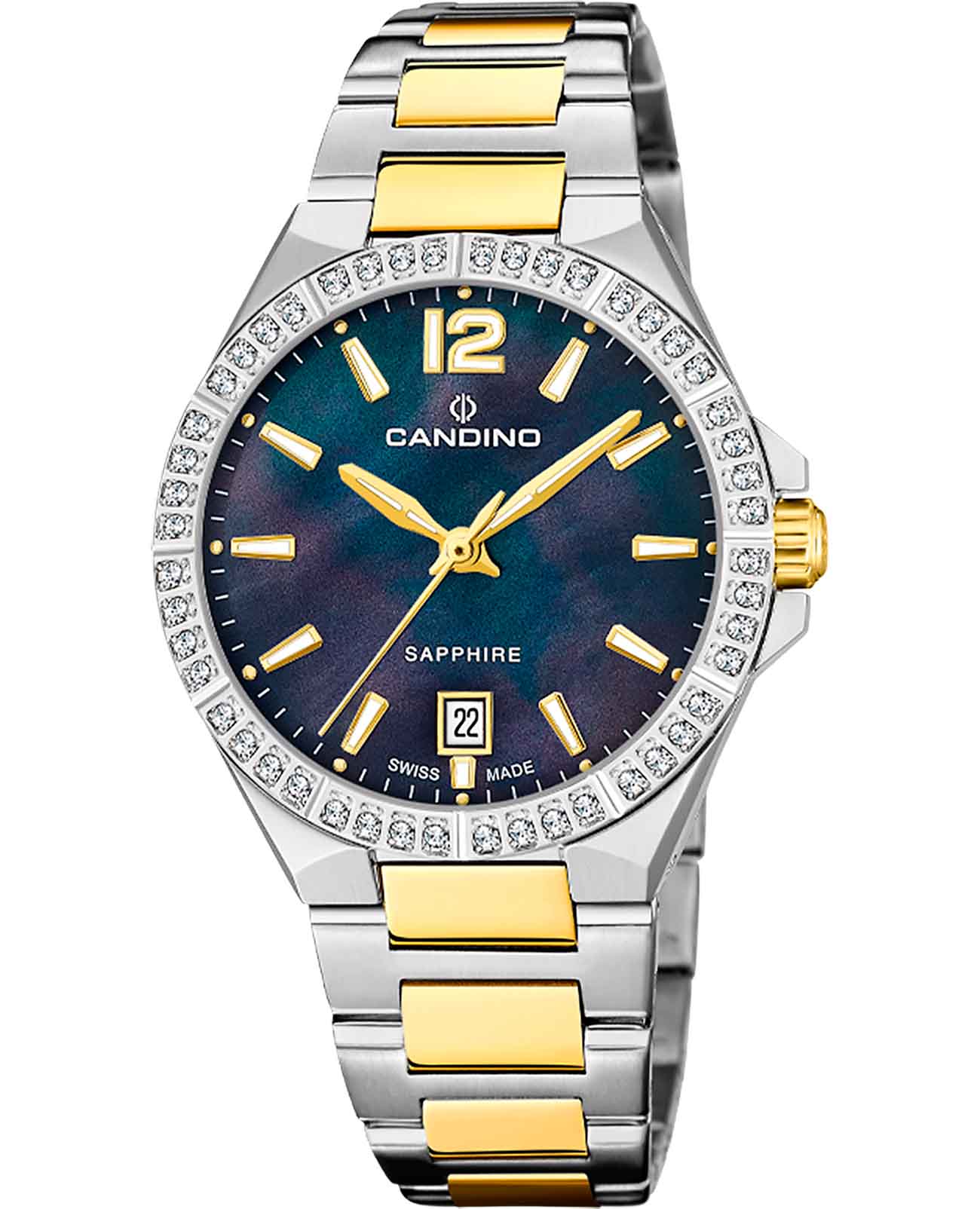 Женские наручные часы Candino C4761/B из коллекции Lady Elegance сочетают в себе элегантный дизайн и надежность современных технологий. Модель обладает круглым корпусом диаметром 34 мм, изготовленным из нержавеющей стали, что обеспечивает высокую устойчивость к внешним воздействиям . Браслет выполнен из металла с частичным PVD-покрытиемPVDУльтратонкое покрытие наносится в технике вакуумного напыления, сочетает в себе нитрид титана особой прочности со слоем золота или оксида хрома. Несёт в себе декоративную или защитную функцию. и с раскладной застежкойРаскладная застёжкаТакой тип застёжки используется только на браслетах из металла. Она никогда не раскрывается полностью, происходит разделение на 2 и более частей. Раскладывающая застёжка снизит вероятность потери часов к минимуму., гарантирующей комфортное ношение и безопасность . Синий перламутровый циферблат оснащен окном даты, а стрелки и метки имеют люминесцентное покрытиеЛюминесцентное покрытиеПозволяет считывать показания времени в темноте. Производители наносят на стрелки, часовые индексы, безель или поверхность циферблата светонакопительный состав, дающий холодное свечение., обеспечивающее видимость в темноте . Для защиты используется сапфировое стеклоСапфировое стеклоПрочный и надёжный материал из кристалла сапфира синтетического происхождения, характеризующийся особой твёрдостью и устойчивостью к царапинам и повреждениям., которое противостоит появлению царапин и обеспечивает длительную сохранность внешнего вида часов . Часы работают на кварцевом механизме, что гарантирует точное время без необходимости подзаводки . Водонепроницаемость часов достигает 5 атмосфер (50 метров), что позволяет использовать их во время повседневных водных процедур, однако не рекомендуется для плавания или дайвинга .