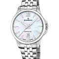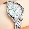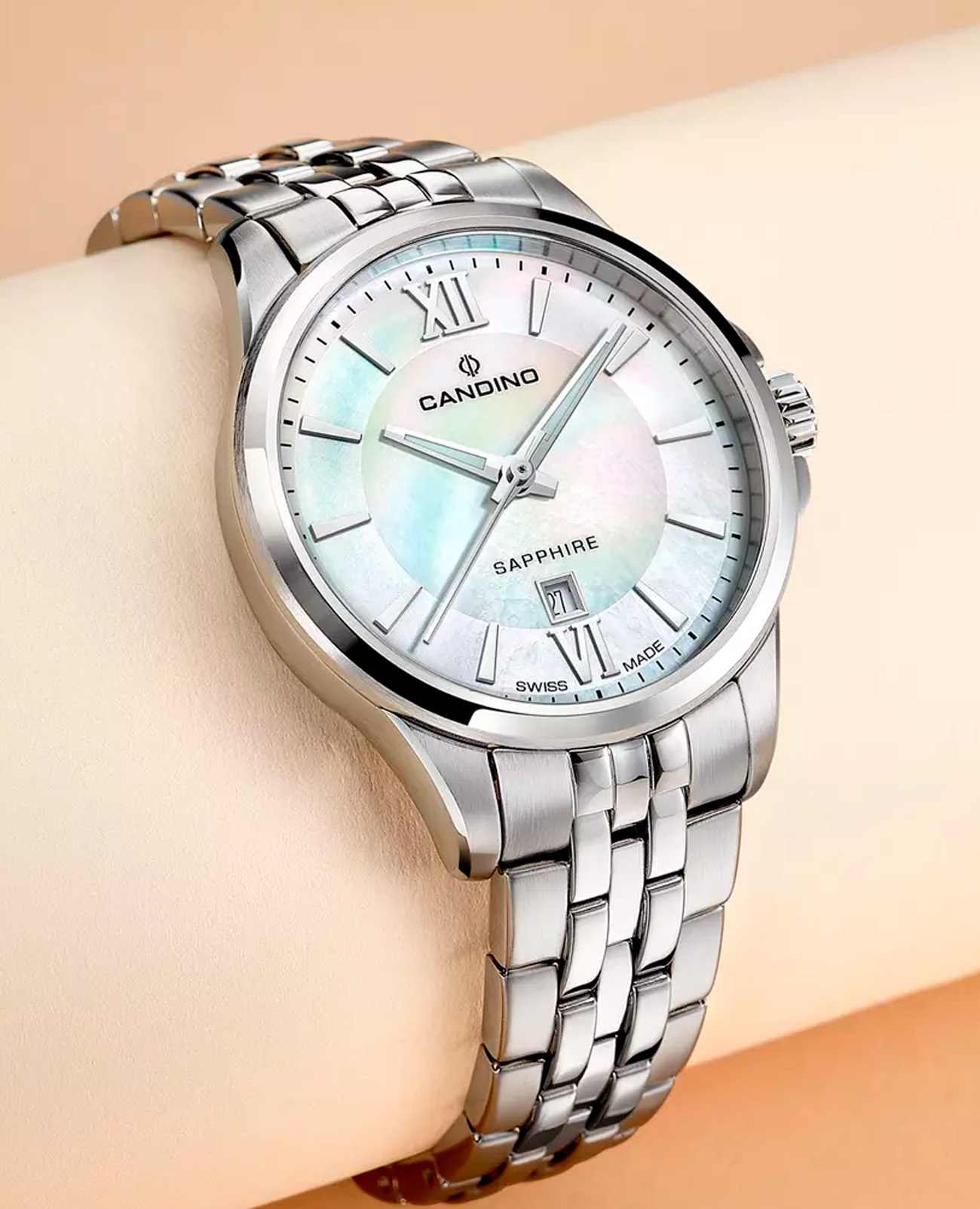 Женские наручные часы Candino C4766/6 из коллекции Lady Elegance сочетают в себе элегантный дизайн и надежность современных технологий. Модель обладает круглым корпусом диаметром 34 мм, изготовленным из нержавеющей стали, что обеспечивает высокую устойчивость к внешним воздействиям . Браслет выполнен из металла с раскладной застежкойРаскладная застёжкаТакой тип застёжки используется только на браслетах из металла. Она никогда не раскрывается полностью, происходит разделение на 2 и более частей. Раскладывающая застёжка снизит вероятность потери часов к минимуму., гарантирующей комфортное ношение и безопасность . Перламутровый циферблат оснащен окном даты, а стрелки имеют люминесцентное покрытиеЛюминесцентное покрытиеПозволяет считывать показания времени в темноте. Производители наносят на стрелки, часовые индексы, безель или поверхность циферблата светонакопительный состав, дающий холодное свечение., обеспечивающее видимость в темноте . Для защиты используется сапфировое стеклоСапфировое стеклоПрочный и надёжный материал из кристалла сапфира синтетического происхождения, характеризующийся особой твёрдостью и устойчивостью к царапинам и повреждениям., которое противостоит появлению царапин и обеспечивает длительную сохранность внешнего вида часов . Часы работают на кварцевом механизме, что гарантирует точное время без необходимости подзаводки . Водонепроницаемость часов достигает 5 атмосфер (50 метров), что позволяет использовать их во время повседневных водных процедур, однако не рекомендуется для плавания или дайвинга .