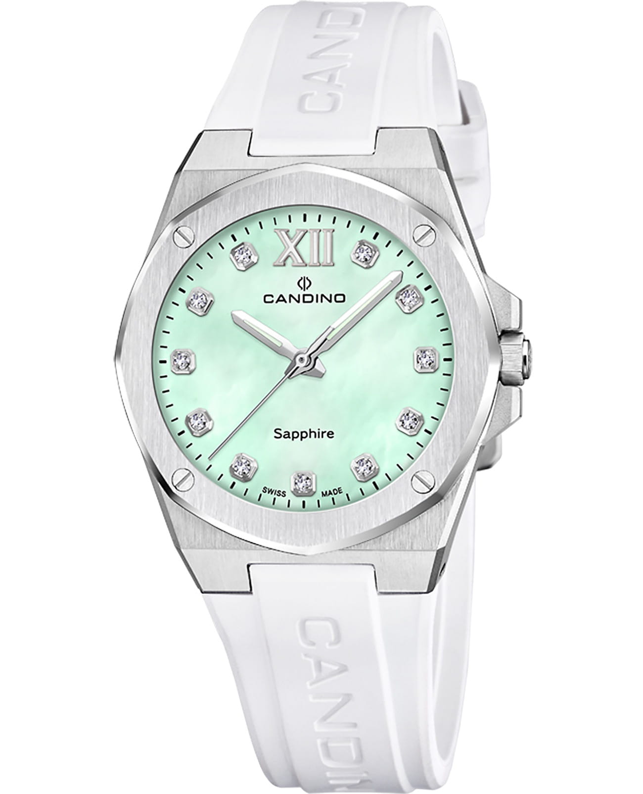 Изысканные женские часы Candino Lady Elegance C4777/9, которые объединяют в себе элегантность и функциональность. Эти часы оснащены кварцевым механизмом, обеспечивающим точное отображение времени, включая часы, минуты и секунды. Корпус выполнен из высококачественной нержавеющей стали, что гарантирует долговечность и стойкость к внешним воздействиям. Сапфировое стеклоСапфировое стеклоПрочный и надёжный материал из кристалла сапфира синтетического происхождения, характеризующийся особой твёрдостью и устойчивостью к царапинам и повреждениям. защищает циферблат, добавляя изделию дополнительную прочность и устойчивость к царапинам. Каучуковый белый ремешок на стандартной застежке гармонично сочетается с общим дизайном, обеспечивая комфортное и надежное прилегание на запястье. Стрелки часов с люминесцентным покрытиемЛюминесцентное покрытиеПозволяет считывать показания времени в темноте. Производители наносят на стрелки, часовые индексы, безель или поверхность циферблата светонакопительный состав, дающий холодное свечение., что облегчает чтение времени даже в условиях слабого освещения. С водонепроницаемостью до 50 метров эти часы подходят для повседневной носки и выдержат воздействие воды при мытье рук или дожде. Эти часы станут идеальным дополнением к вашему гардеробу, добавляя нотку утонченности и стиля в любой образ.