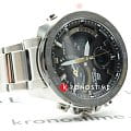 Достаточно внушительный чёрный циферблат имеет золотистые акценты, оригинально смотрится необычное расположение счётчиков. Многофункциональная модель пригодится на любой случай жизни, ведь она оснащена Bluetooth 4.0BluetoothСовременная технология, позволяющая синхронизировать часы с телефоном и переносить данные. Часы с Bluetooth расширяют возможности вашего смартфона и делают его использование ещё более удобным., хронографомХронографФункция позволяет измерять отрезки времени с особой точностью: часы, минуты, секунды. Верным признаком хронографа является наличие на циферблате 3 дополнительных окошек-счётчиков., секундомером, тахиметромТахиметрРазмеченная шкала, располагается на ободке или безеле часов. Тахиметр позволяет рассчитать скорость на определённом участке пути, расстояние измеряется в километрах или милях., таймером, будильником, календарём, есть мировое времяМировое время Полезное часовое усложнение, отображающее время в основных городах и известных областях по всему миру, оно связано с часовыми поясами, удобно для путешественников и бизнесменов. и функция поиска телефона. Питание поступает от солнечной энергии - . Водонепроницаемость до 10 бар. Корпус, браслет, безельБезельВнешний ободок, закрепляющий стекло. В спортивных часах так называется поворотное кольцо с делениями на циферблате, выполняет роль таймера – замеряет отрезки времени на шкале. Неподвижный безель – элемент декора. Однонаправленно вращающийся безель на дайверских часах позволяет фиксировать моменты погружения и выныривания на поверхность. из хирургической стали 316L. Минеральное стекло. Двойная светодиодная подсветкаСветодиодная подсветкаСветодиодная или LED-подсветка обеспечивает появление яркого холодного свечения за счёт LED-элементов - маленьких лампочек. Они потребляют минимальное количество энергии, чаще всего можно встретить 1 светодиод, в нижней части циферблата.. Габариты: 51,5 x 48 x 13,9 мм.