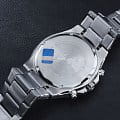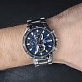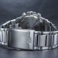 Ярко-синий циферблат стильно смотрится в сочетании с контрастными элементами оформления. Кварцевый хронографХронографФункция позволяет измерять отрезки времени с особой точностью: часы, минуты, секунды. Верным признаком хронографа является наличие на циферблате 3 дополнительных окошек-счётчиков. имеет крупную индикацию времени, что позволяет без проблем считывать информацию даже при беглом взгляде на запястье. Ударопрочный корпусУдаропрочный корпусМеханизм заключён в корпус, выполненный из современных материалов, устойчивых к ударам, механическим повреждениям и падению с высоты: инновационный пластик, карбон, нержавеющая сталь, титан. и браслет выполнены из нержавеющей стали 316L, отличающейся долговечностью. Кварцевый механизм с точностью хода +/- 30 секунд в месяц. Срок службы батарейки - 2 года. Закручивающаяся задняя крышка. Люминесцентная подсветка NeobriteЛюминесцентное покрытиеПозволяет считывать показания времени в темноте. Производители наносят на стрелки, часовые индексы, безель или поверхность циферблата светонакопительный состав, дающий холодное свечение.. Водонепроницаемость до 10 бар. БезельБезельВнешний ободок, закрепляющий стекло. В спортивных часах так называется поворотное кольцо с делениями на циферблате, выполняет роль таймера – замеряет отрезки времени на шкале. Неподвижный безель – элемент декора. Однонаправленно вращающийся безель на дайверских часах позволяет фиксировать моменты погружения и выныривания на поверхность. с чёрным IP-покрытиемIP-покрытиеМетод ионного напыления. Демонстрирует повышенную устойчивость к истиранию, окислению и химическим веществам. Под воздействием высокого давления и температуры около 1500°C молекулы металла надёжно соединяются с частицами корпуса часов.. Минеральное стекло. Секундомер, отображение даты. Габариты: 43,4 x 48,1 x 11,4 мм.