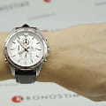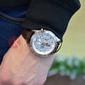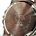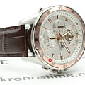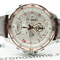 Практичный и надёжный аксессуар стильно смотрится на запястье и подходит к любой одежде. Светлый циферблат дополнен контрастными стрелками, часовыми метками и счётчиками, что обеспечивает идеальную читаемость показателей. Особую привлекательность представляет собой безельБезельВнешний ободок, закрепляющий стекло. В спортивных часах так называется поворотное кольцо с делениями на циферблате, выполняет роль таймера – замеряет отрезки времени на шкале. Неподвижный безель – элемент декора. Однонаправленно вращающийся безель на дайверских часах позволяет фиксировать моменты погружения и выныривания на поверхность. цвета розового золота. Высокоточный кварцевый механизм Miyota с точностью хода +/- 15 сек/мес. Коричневый ремешок из натуральной кожи. Закаленное минеральное стекло. Люминесцентная подсветкаЛюминесцентное покрытиеПозволяет считывать показания времени в темноте. Производители наносят на стрелки, часовые индексы, безель или поверхность циферблата светонакопительный состав, дающий холодное свечение.. Водонепроницаемость до 100 метров. Отображение даты, секундомер. Габариты: 47,2 x 54 x 13,9 мм.