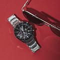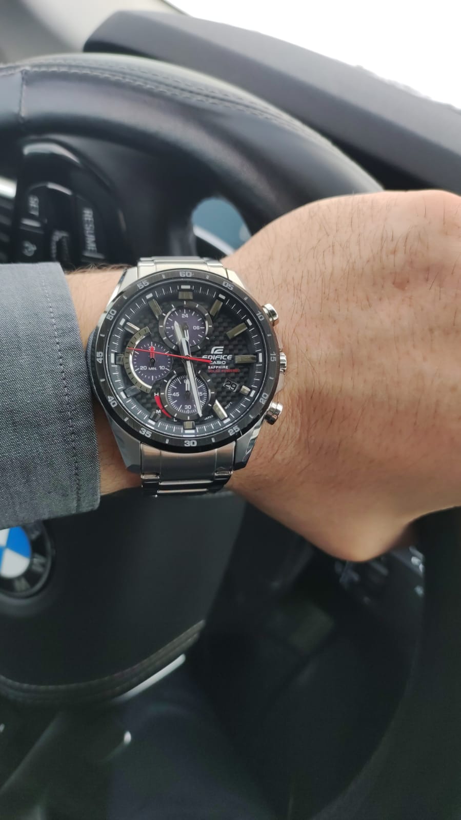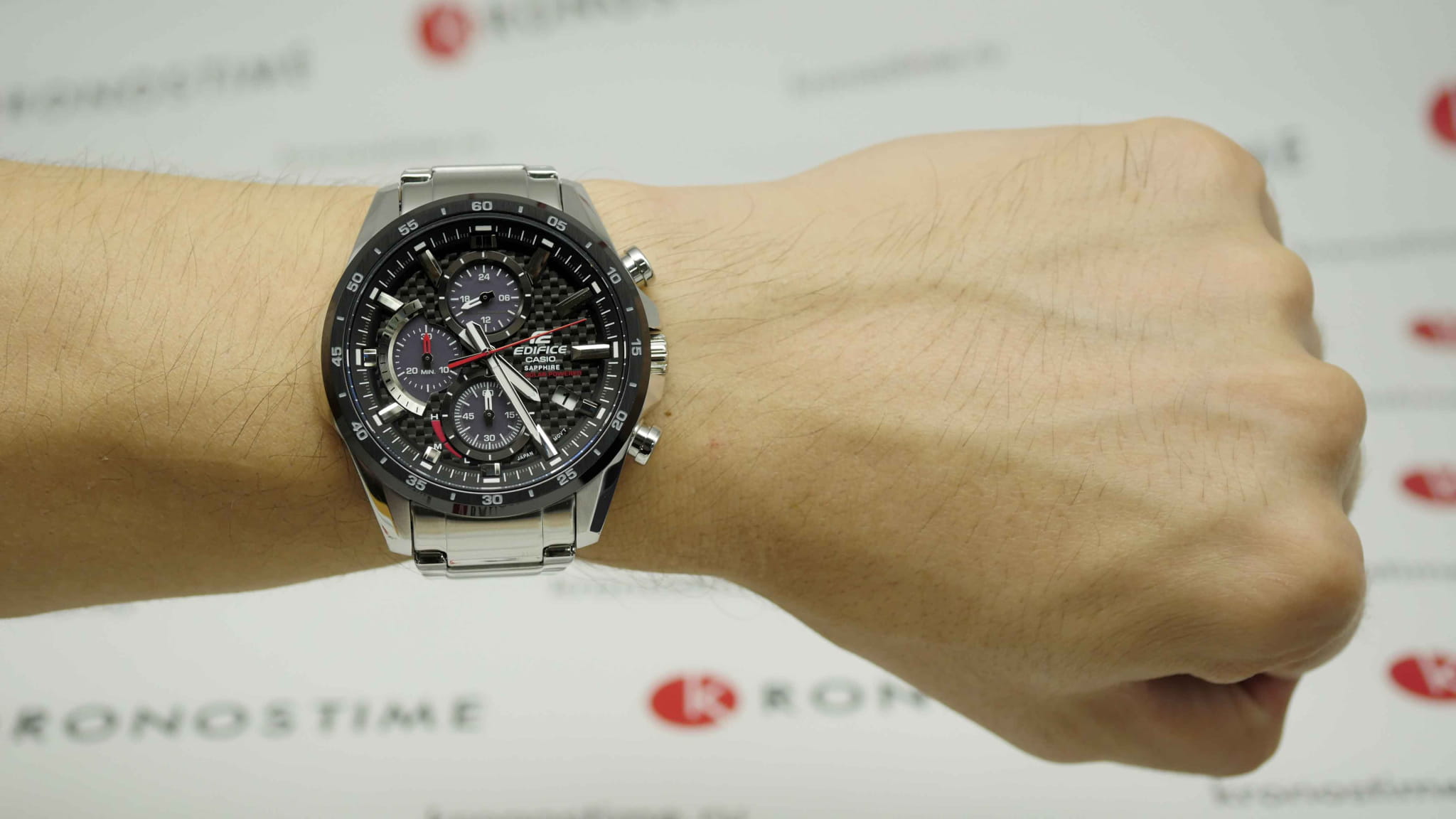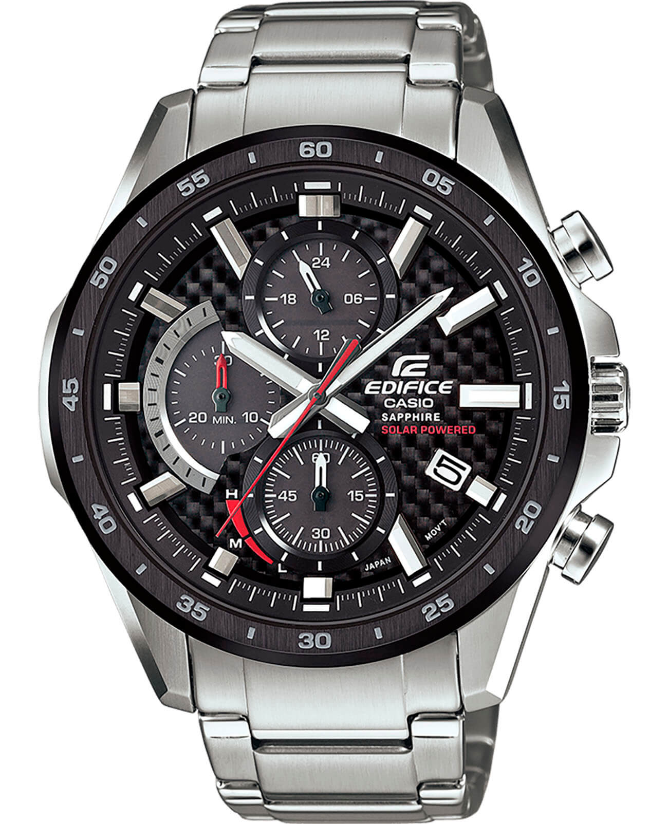 Габаритные наручные часы станут ключевой деталью для повседневного образа, привлекательно выглядят элементы красного цвета. Интерес вызывает необычный тёмный циферблат, имеющий карбоновую текстуру, переплетённые волокна образуют оригинальный узор. Ударопрочный корпусУдаропрочный корпусМеханизм заключён в корпус, выполненный из современных материалов, устойчивых к ударам, механическим повреждениям и падению с высоты: инновационный пластик, карбон, нержавеющая сталь, титан. и браслет на раскладной застёжкеРаскладная застёжкаТакой тип застёжки используется только на браслетах из металла. Она никогда не раскрывается полностью, происходит разделение на 2 и более частей. Раскладывающая застёжка снизит вероятность потери часов к минимуму. сделаны из стали 316L с антикоррозионными свойствами, за счёт чего часы надолго сохранят безупречный внешний вид. Модель получает питание от солнечного света Tough SolarTough SolarТехнология основана на подзарядке аккумулятора от источника солнечного света, специальная панель улавливает солнечные лучи и преобразует их в энергию для работы часов. Достаточно пары минут нахождения на солнце для функционирования часов в течении суток., состояние заряда можно отслеживать благодаря наличию особого индикатора. БезельБезельВнешний ободок, закрепляющий стекло. В спортивных часах так называется поворотное кольцо с делениями на циферблате, выполняет роль таймера – замеряет отрезки времени на шкале. Неподвижный безель – элемент декора. Однонаправленно вращающийся безель на дайверских часах позволяет фиксировать моменты погружения и выныривания на поверхность. с чёрным IP-покрытиемIP-покрытиеМетод ионного напыления. Демонстрирует повышенную устойчивость к истиранию, окислению и химическим веществам. Под воздействием высокого давления и температуры около 1500°C молекулы металла надёжно соединяются с частицами корпуса часов.. Закручивающаяся крышка с резьбовым соединением. Водонепроницаемость 100 метров. Подсветка NeobriteПодсветка NeobriteИспользование светонакопительных составов на основе сульфида цинка или алюмината стронция, яркий свет можно наблюдать на протяжении 6-10 часов после «зарядки» часов около источника света.. Сапфировое стеклоСапфировое стеклоПрочный и надёжный материал из кристалла сапфира синтетического происхождения, характеризующийся особой твёрдостью и устойчивостью к царапинам и повреждениям.. Часы-хронографХронографФункция позволяет измерять отрезки времени с особой точностью: часы, минуты, секунды. Верным признаком хронографа является наличие на циферблате 3 дополнительных окошек-счётчиков. с секундомеромСекундомерСекундоме́р — прибор, способный измерять интервалы времени с точностью до долей секунды. с точностью показаний 1с и временем измерения 30мин. Габариты: 51,5 x 47,6 x 12 мм.