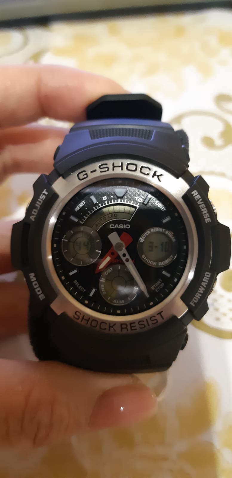 Наручные часы имеют противоударный корпусУдаропрочный корпусМеханизм заключён в корпус, выполненный из современных материалов, устойчивых к ударам, механическим повреждениям и падению с высоты: инновационный пластик, карбон, нержавеющая сталь, титан. из полимерного пластика, материал безупречно противостоит силе удара, вибрациям, выдерживает падение с большой высоты. Внимание привлекают стальной безельБезельВнешний ободок, закрепляющий стекло. В спортивных часах так называется поворотное кольцо с делениями на циферблате, выполняет роль таймера – замеряет отрезки времени на шкале. Неподвижный безель – элемент декора. Однонаправленно вращающийся безель на дайверских часах позволяет фиксировать моменты погружения и выныривания на поверхность. и насыщенно-красная часовая стрелка. Гибкий полимерный ремешок надёжно крепится на запястье и обеспечивает комфорт при ношении. Японский кварцевый механизм работает от батарейки, рассчитанной на 3 года. Прочное минеральное стеклоМинеральное стеклоМинеральное стекло представляет собой искусственно выращенный минерал кварца. Такое стекло отличается особой устойчивостью к повреждениям и царапинам. Уступает по некоторым качествам сапфировому стеклу.. 12/24-часовой формат отображения времени. светодиодная подсветкаСветодиодная подсветкаСветодиодная или LED-подсветка обеспечивает появление яркого холодного свечения за счёт LED-элементов - маленьких лампочек. Они потребляют минимальное количество энергии, чаще всего можно встретить 1 светодиод, в нижней части циферблата. дисплея с автоматическим режимом, стрелки и метки с люминесцентной подсветкойЛюминесцентное покрытиеПозволяет считывать показания времени в темноте. Производители наносят на стрелки, часовые индексы, безель или поверхность циферблата светонакопительный состав, дающий холодное свечение.. Водостойкость до 20 бар. ТаймерТаймерОтсчитывает секунды в обратном направлении в заданном интервале времени. с возможностью автоповтора, секундомерСекундомерСекундоме́р — прибор, способный измерять интервалы времени с точностью до долей секунды., будильникБудильникБуди́льник — часы, в заданный момент времени подающие звуковой, световой и/или в редких случаях другой сигнал., мировое времяМировое время Полезное часовое усложнение, отображающее время в основных городах и известных областях по всему миру, оно связано с часовыми поясами, удобно для путешественников и бизнесменов. , календарь. Габариты: 46,4 x 52 x 14,9 мм.