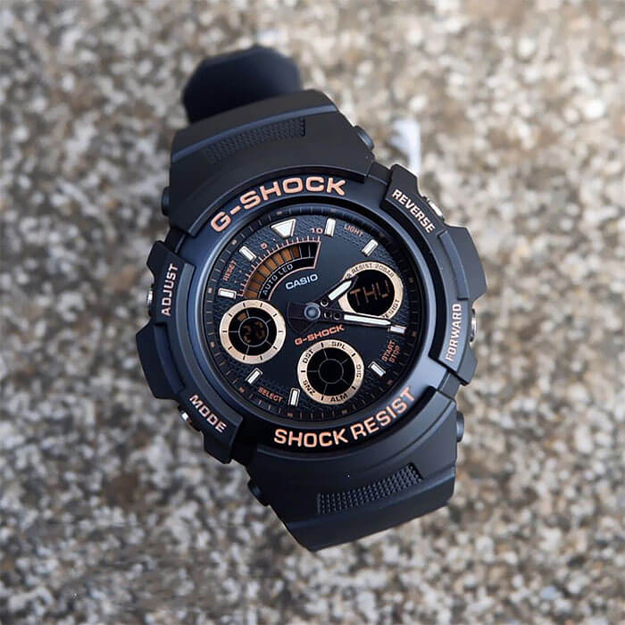 Компактный аксессуар имеет противоударный корпусУдаропрочный корпусМеханизм заключён в корпус, выполненный из современных материалов, устойчивых к ударам, механическим повреждениям и падению с высоты: инновационный пластик, карбон, нержавеющая сталь, титан. из полимерного материала, способного выдерживать падения с высоты и повреждения. Привлекательно смотрится безельБезельВнешний ободок, закрепляющий стекло. В спортивных часах так называется поворотное кольцо с делениями на циферблате, выполняет роль таймера – замеряет отрезки времени на шкале. Неподвижный безель – элемент декора. Однонаправленно вращающийся безель на дайверских часах позволяет фиксировать моменты погружения и выныривания на поверхность. из нержавеющей стали 316L с IP-покрытиемIP-покрытиеМетод ионного напыления. Демонстрирует повышенную устойчивость к истиранию, окислению и химическим веществам. Под воздействием высокого давления и температуры около 1500°C молекулы металла надёжно соединяются с частицами корпуса часов., а также детали в цвете розового золота. Аналого-цифровые часы работают от батарейки, рассчитанной на 3 года безупречной эксплуатации. Минеральное стекло. Автоматическая светодиодная подсветкаСветодиодная подсветкаСветодиодная или LED-подсветка обеспечивает появление яркого холодного свечения за счёт LED-элементов - маленьких лампочек. Они потребляют минимальное количество энергии, чаще всего можно встретить 1 светодиод, в нижней части циферблата. дисплея, стрелки и метки с люминесцентным покрытиемЛюминесцентное покрытиеПозволяет считывать показания времени в темноте. Производители наносят на стрелки, часовые индексы, безель или поверхность циферблата светонакопительный состав, дающий холодное свечение.. 12/24-часовое отображение времени. Надёжный полимерный ремешок. Водонепроницаемость 200 метров. Дополнительные возможности: таймер, будильник, мировое времяМировое время Полезное часовое усложнение, отображающее время в основных городах и известных областях по всему миру, оно связано с часовыми поясами, удобно для путешественников и бизнесменов. , секундомер, автоматический календарь. Габариты: 46,4 x 52 x 14,9 мм.