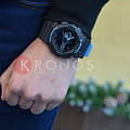 Оригинально смотрится двухцветный ремешок с внутренней стороной ярко-голубого цвета. Многоуровневый циферблат защищает закаленное минеральное стекло, устойчивое к царапинам. Японский кварцевый механизм получает питание от аккумулятора, срок службы которого составляет 2 года. Противоударный корпусУдаропрочный корпусМеханизм заключён в корпус, выполненный из современных материалов, устойчивых к ударам, механическим повреждениям и падению с высоты: инновационный пластик, карбон, нержавеющая сталь, титан. из полимерного пластика. Водонепроницаемость 20 бар. Устранение влияния магнитного поля. Светодиодная подсветкаСветодиодная подсветкаСветодиодная или LED-подсветка обеспечивает появление яркого холодного свечения за счёт LED-элементов - маленьких лампочек. Они потребляют минимальное количество энергии, чаще всего можно встретить 1 светодиод, в нижней части циферблата.. Секундомер, хронографХронографФункция позволяет измерять отрезки времени с особой точностью: часы, минуты, секунды. Верным признаком хронографа является наличие на циферблате 3 дополнительных окошек-счётчиков., расчёт средней скорости пройденного пути, календарь до 2099 года, мировое времяМировое время Полезное часовое усложнение, отображающее время в основных городах и известных областях по всему миру, оно связано с часовыми поясами, удобно для путешественников и бизнесменов. , таймер, будильник. Габариты: 55 x 51,2 x 16,9 мм.