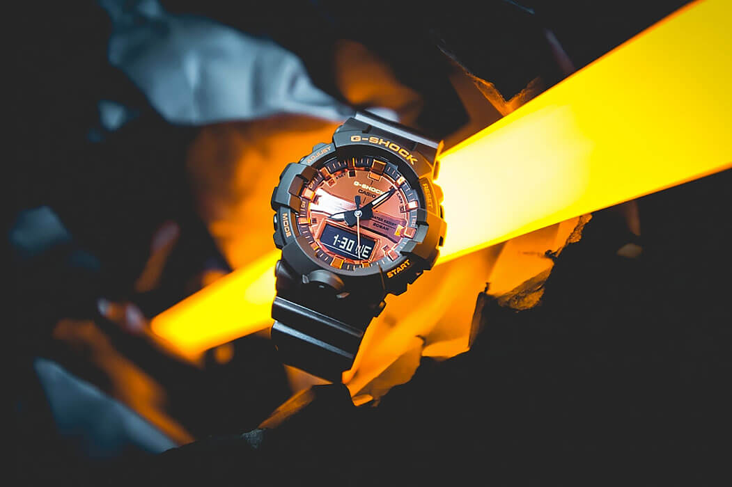 Дизайн модели умело комбинирует спортивные и fashion-элементы, чёрный матовый противоударный корпусУдаропрочный корпусМеханизм заключён в корпус, выполненный из современных материалов, устойчивых к ударам, механическим повреждениям и падению с высоты: инновационный пластик, карбон, нержавеющая сталь, титан. красиво обрамляет циферблат ярко-оранжевого цвета. По сравнению с часами серии GA-700, аксессуар получил уменьшенный размер корпуса, что положительно сказалось на комфортном ношении. Кварцевый калибр японского производства работает от батарейки, срок её службы составляет 3 года. Белая светодиодная подсветкаСветодиодная подсветкаСветодиодная или LED-подсветка обеспечивает появление яркого холодного свечения за счёт LED-элементов - маленьких лампочек. Они потребляют минимальное количество энергии, чаще всего можно встретить 1 светодиод, в нижней части циферблата. циферблата, стрелки с люминесцентным покрытиемЛюминесцентное покрытиеПозволяет считывать показания времени в темноте. Производители наносят на стрелки, часовые индексы, безель или поверхность циферблата светонакопительный состав, дающий холодное свечение.. Прочный полимерный ремешок. Водонепроницаемость 20 бар. Минеральное стекло. 12/24-часовое отображение времени. Секундомер с точностью в 1/100 секунды, мировое времяМировое время Полезное часовое усложнение, отображающее время в основных городах и известных областях по всему миру, оно связано с часовыми поясами, удобно для путешественников и бизнесменов. , таймер, будильник, календарь. Габариты: 54,1 x 48,6 x 15,5 мм.