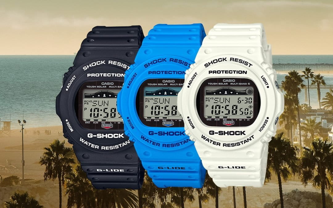 Компактная модель в олдскул корпусе из профессиональной серии для серферов — G-SHOCK G-LIDE. Данная модель в белой расцветке позволяет отображать на дисплее графики приливов и фазы Луны, что позволяет получать информацию о текущих погодных условиях для серфинга, а радио-синхронизация времени позволит автоматически корректировать текущее время в любой точке мира.