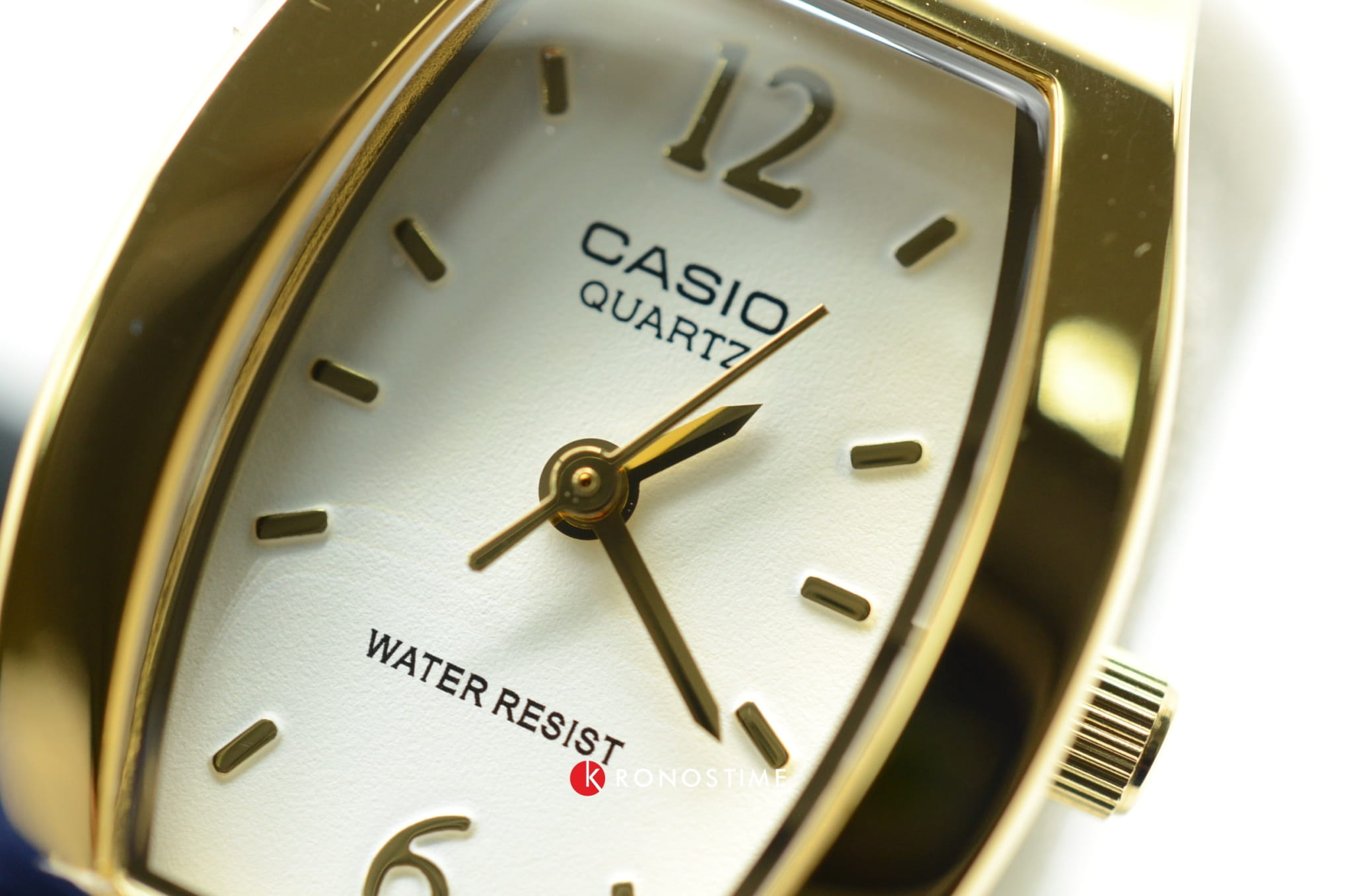 Модель от Casio выполнена в классическом стиле и призвана придавать эффектности и шарма своей обладательнице. Выпуклый по бокам корпус часов сделан из латуни. Яркий, золотой браслет с раскладывающейся застежкой сделан из нержавеющей стали с IP-покрытиемIP-покрытиеМетод ионного напыления. Демонстрирует повышенную устойчивость к истиранию, окислению и химическим веществам. Под воздействием высокого давления и температуры около 1500°C молекулы металла надёжно соединяются с частицами корпуса часов.. На белом циферблате аккуратно расположены штрихи и арабские цифры. Часы защищены от повреждений минеральным стеклом. Все детали прочно соединены между собой в единое целое. Кварцевые часы работают от батарейки. Вес аксессуара равен 48 граммам.
