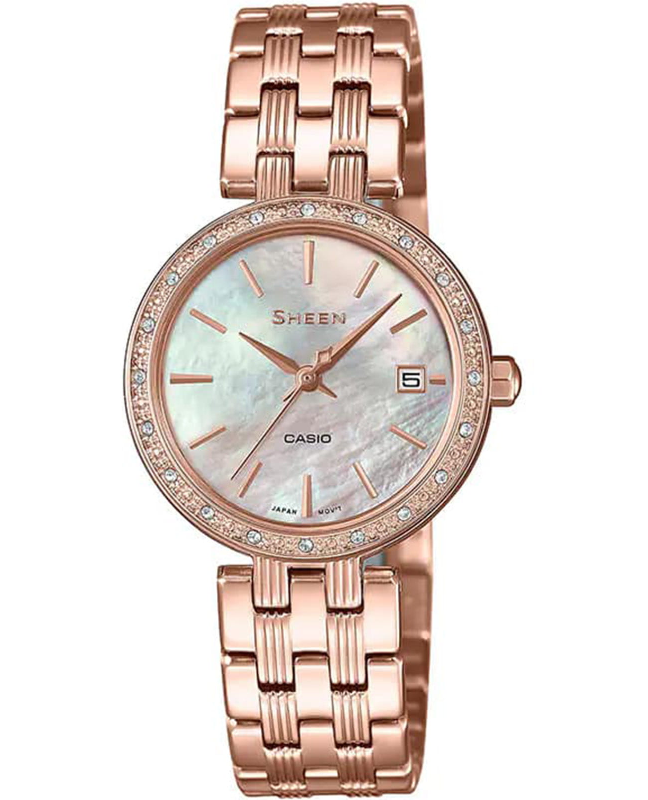 Женские японские наручные часы на браслете Casio Sheen SHE-4060PG-4AUDF, кварцевый механизм с высокой точностью. Класс водозащиты: 50 метров, позволит защитить корпус от случайных брызг или капель дождя. Корпус часов изготовлены из нержавеющей стали с IP-покрытиемIP-покрытиеМетод ионного напыления. Демонстрирует повышенную устойчивость к истиранию, окислению и химическим веществам. Под воздействием высокого давления и температуры около 1500°C молекулы металла надёжно соединяются с частицами корпуса часов.. Минеральное стеклоМинеральное стеклоМинеральное стекло представляет собой искусственно выращенный минерал кварца. Такое стекло отличается особой устойчивостью к повреждениям и царапинам. Уступает по некоторым качествам сапфировому стеклу. устойчивое к мелким механическим повреждениям. БезельБезельВнешний ободок, закрепляющий стекло. В спортивных часах так называется поворотное кольцо с делениями на циферблате, выполняет роль таймера – замеряет отрезки времени на шкале. Неподвижный безель – элемент декора. Однонаправленно вращающийся безель на дайверских часах позволяет фиксировать моменты погружения и выныривания на поверхность. инкрустирован кристаллами. Окошко даты находится в положении 3 часа.