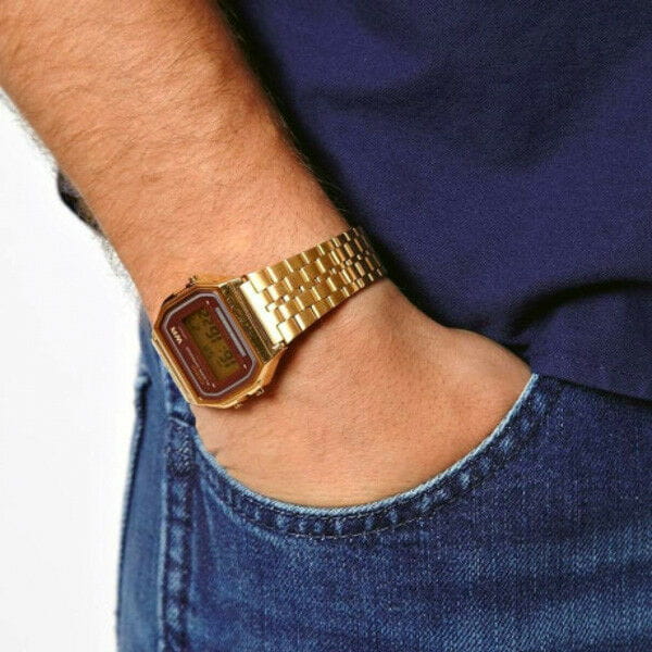 Японские часы унисекс Casio Vintage A159WGEA-9A, кварцевый механизм с высокой точностью. Класс водозащиты: 30 метров, позволит защитить корпус от случайных брызг или капель дождя. Корпус часов изготовлен из пластика, золотистого цвета.