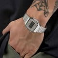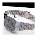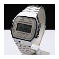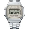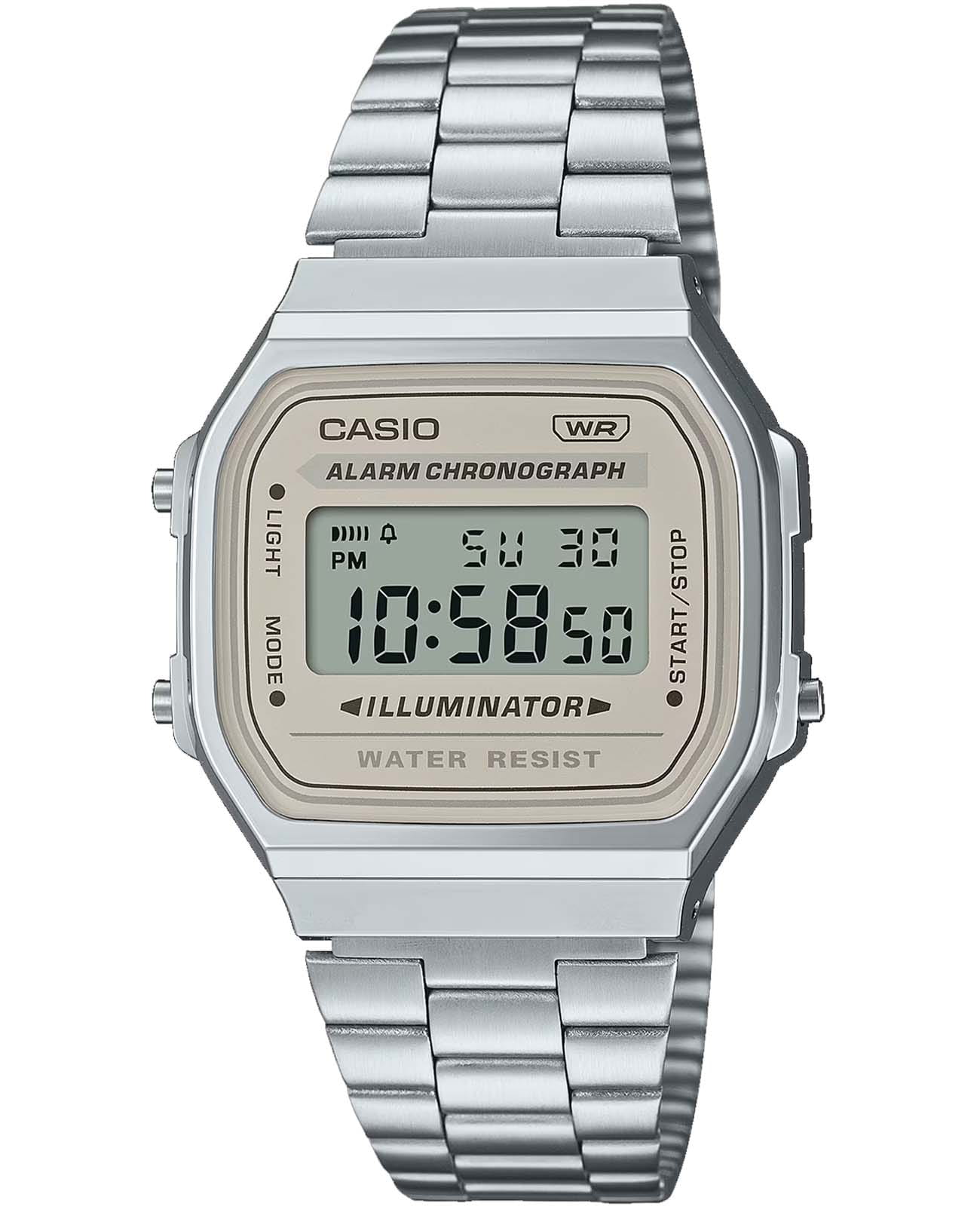 Винтажные японские часы Casio Vintage A168WA-8AYDF. Корпус часов выполнен из пластика. Стальной браслет на раскладном замкеРаскладной замокДанный вариант застежки используется только на часах с металлическим браслетом. Отличительная особенность такого крепления в том, что длина браслета становится универсальной и вы можете самостоятельно отрегулировать нужный вам размер – застежка просто двигается по браслету часов.. Автоматический вечный календарьВечный календарьКлассическое часовое усложнение, представляющее собой календарь, рассчитанный на несколько лет вперёд (стандартно – до 2099 года). Определяет текущую дату, день недели, месяц.. 12 и 24-часовой формат времени. Акриловое стекло. БудильникБудильникБуди́льник — часы, в заданный момент времени подающие звуковой, световой и/или в редких случаях другой сигнал., таймерТаймерОтсчитывает секунды в обратном направлении в заданном интервале времени., секундомерСекундомерСекундоме́р — прибор, способный измерять интервалы времени с точностью до долей секунды.. Электролюминесцентная подсветкаЭлектролюминесцентная подсветкаЭлектролюминесцентная панель устанавливается под ЖК-экраном часов, при нажатии кнопки электричество преобразуется в свет за счёт подачи напряжения на атомы фосфора, такой тип подсветки позволяет освещать весь циферблат. циферблата. Класс водозащиты: 30 метров, позволит защитить корпус от случайных брызг или капель дождя.
