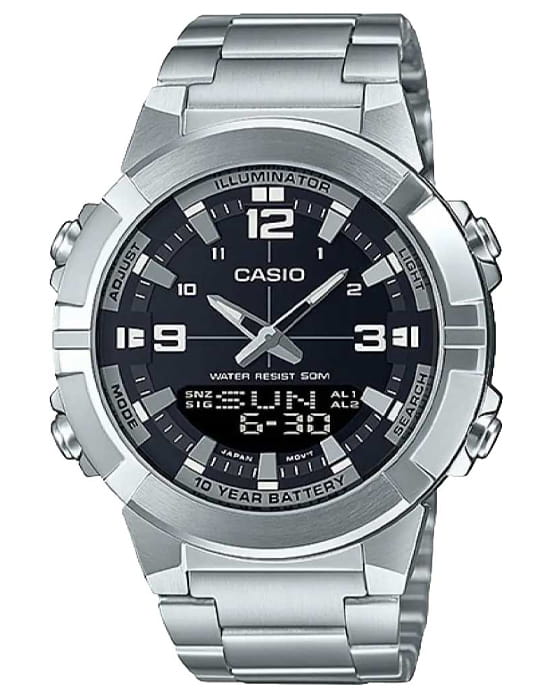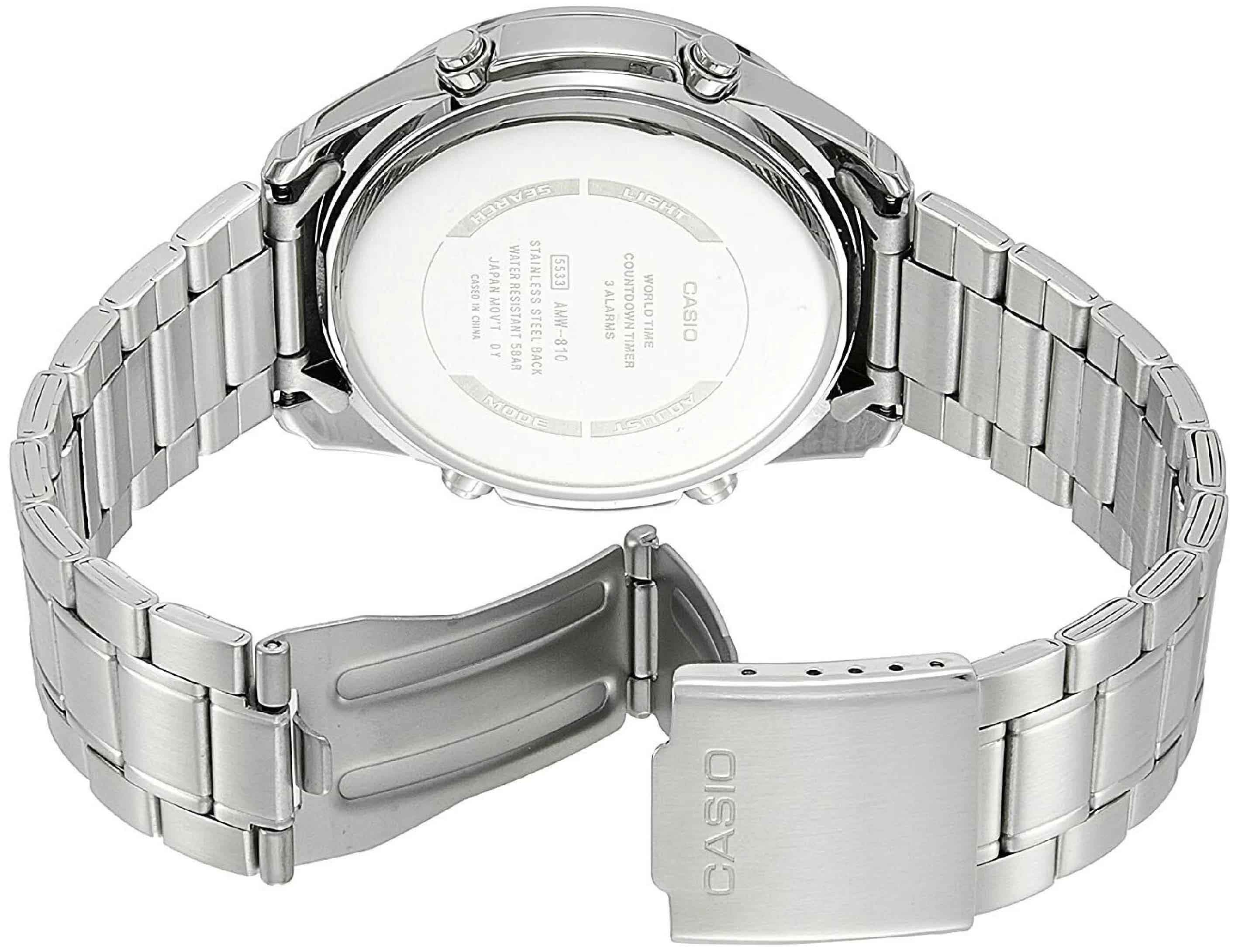 Спортивные японские мужские наручные часы Casio Collection AMW-870D-1A с минеральным стекломМинеральное стеклоМинеральное стекло представляет собой искусственно выращенный минерал кварца. Такое стекло отличается особой устойчивостью к повреждениям и царапинам. Уступает по некоторым качествам сапфировому стеклу. , устойчивым к мелким механическим повреждениям. Циферблат подсвечивается светодиодомСветодиодная подсветкаСветодиодная или LED-подсветка обеспечивает появление яркого холодного свечения за счёт LED-элементов - маленьких лампочек. Они потребляют минимальное количество энергии, чаще всего можно встретить 1 светодиод, в нижней части циферблата.. НеобритовоеПодсветка NeobriteИспользование светонакопительных составов на основе сульфида цинка или алюмината стронция, яркий свет можно наблюдать на протяжении 6-10 часов после «зарядки» часов около источника света. светонакопительное покрытие обеспечивает длительное послесвечение в темноте даже после кратковременного нахождения на свету. Записная книжка на 30 ячеек памяти для записи имен и телефонных номеров, каждая запись может включать в себя текст из 8 букв и 16 цифр. 12-ти и 24-х часовой формат времени. СекундомерСекундомерСекундоме́р — прибор, способный измерять интервалы времени с точностью до долей секунды. с точностью показаний 1/100с и временем измерения 24ч. сплит-хронографСплит-хронографИспользуется для измерения продолжительности нескольких временных отрезков, начинающихся одновременно, а заканчивающихся в разное время.. Таймер обратного отсчета от 1мин до 24ч. Мировое время Мировое время Полезное часовое усложнение, отображающее время в основных городах и известных областях по всему миру, оно связано с часовыми поясами, удобно для путешественников и бизнесменов. – 30 городов (29 часовых поясов). Функция включения/отключения летнего времени.